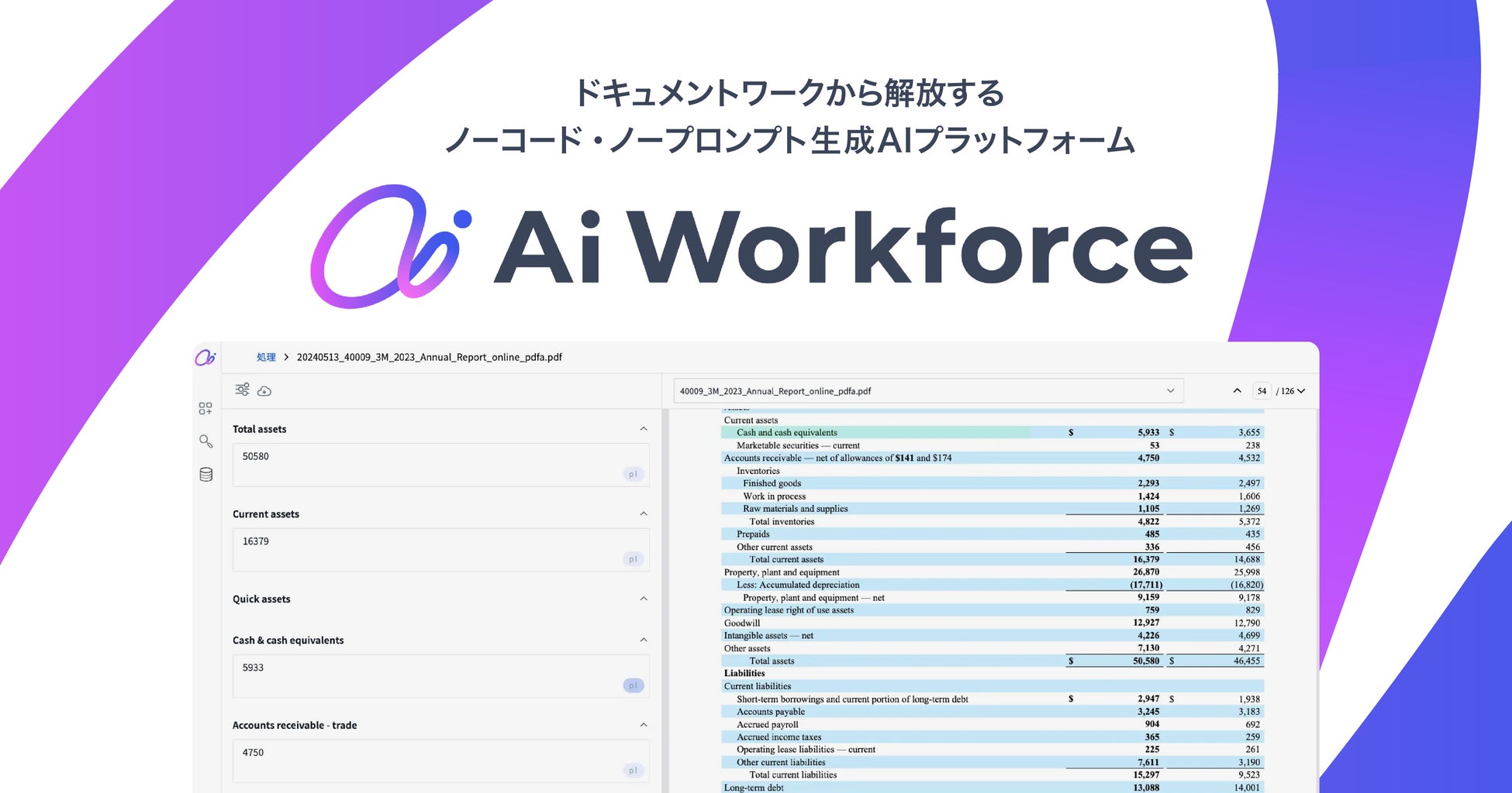 Ai Workforceは、文書処理業務を効率化するノーコード・ノープロンプトの生成AIプラットフォームです。PDFや Microsoft Word、Microsoft Excel 等のファイルを読み、情報を整理・転記したり、レビューを行う業務を効率化します。