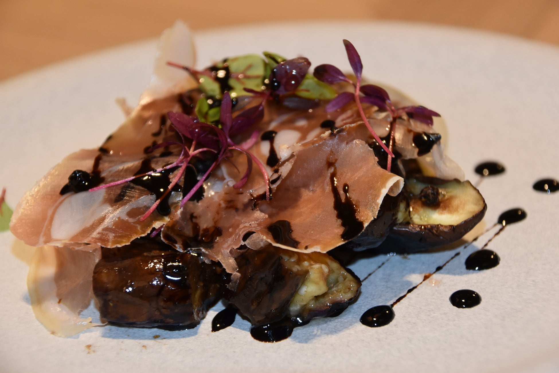 炭火で焼いた茄子のアグロドルチェ 熟成生ハムと無花果の黒胡椒風味
