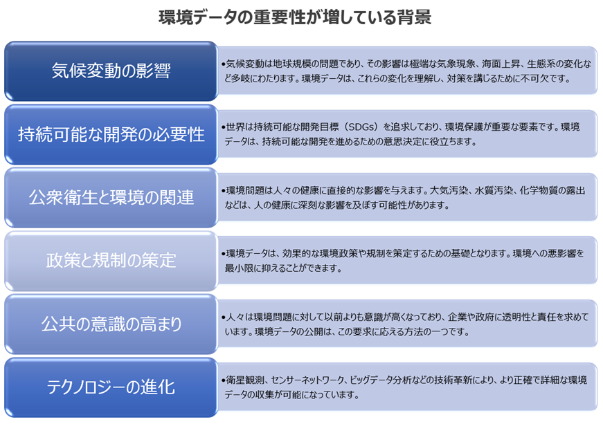 これらの要因により、環境データは環境の保全、持続可能な開発、そして人類の福祉のためにますます重要な役割を果たしています。