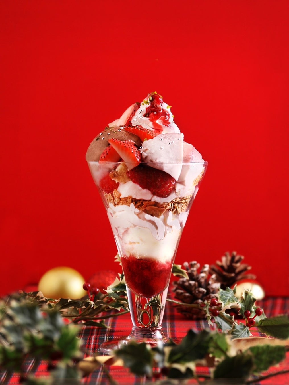 内容:濃厚なチョコアイスとストロベリーショートケーキアイス、なめらかな豆乳プリン、サクサクのフレークにいちごやベリーソースが華やかに彩るクリスマス限定デザート