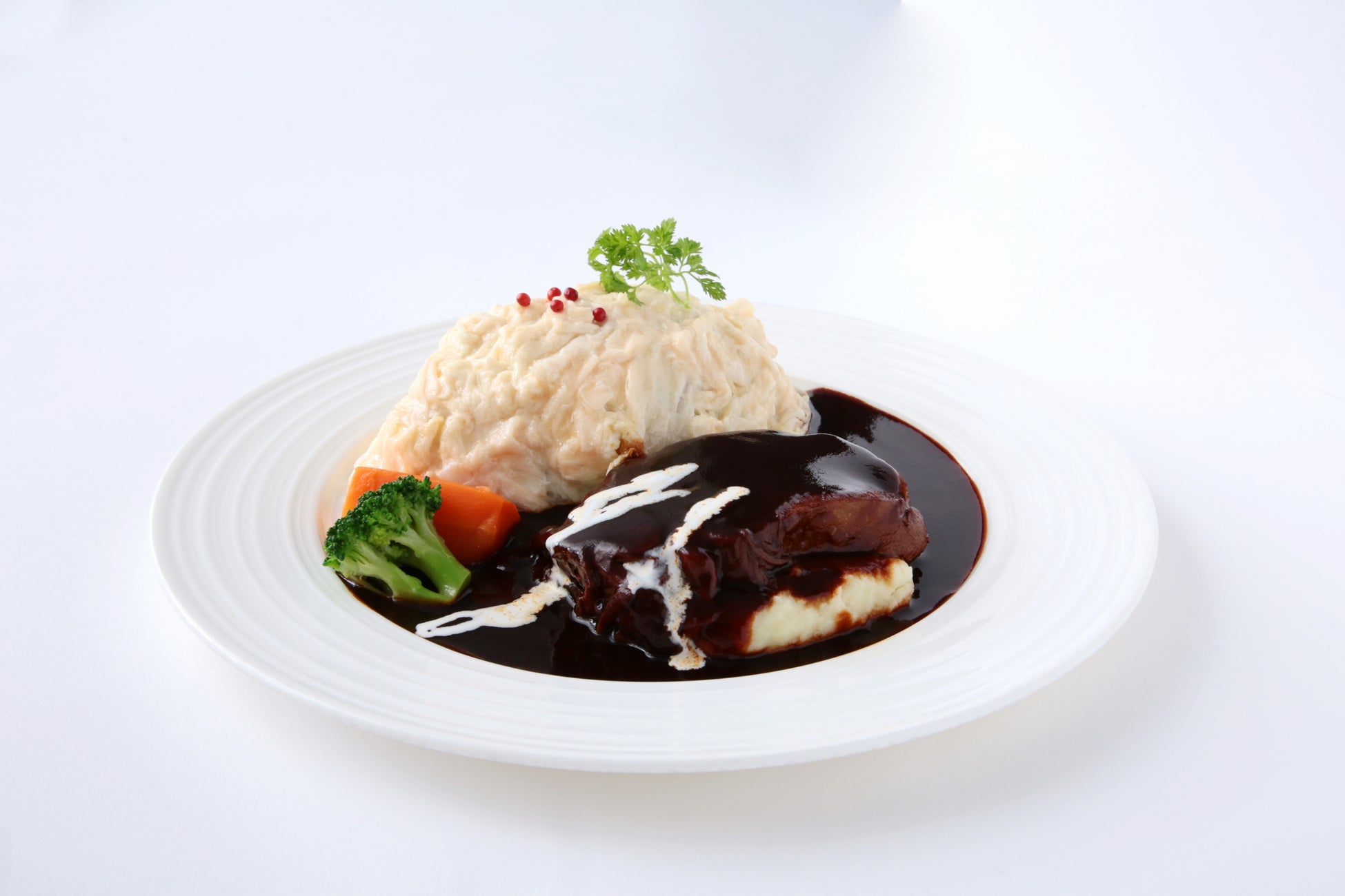 内容:柔らかく煮込んだタンシチューと、白い卵で包んだふわとろオムライスを盛り合わせた贅沢感のある一品。