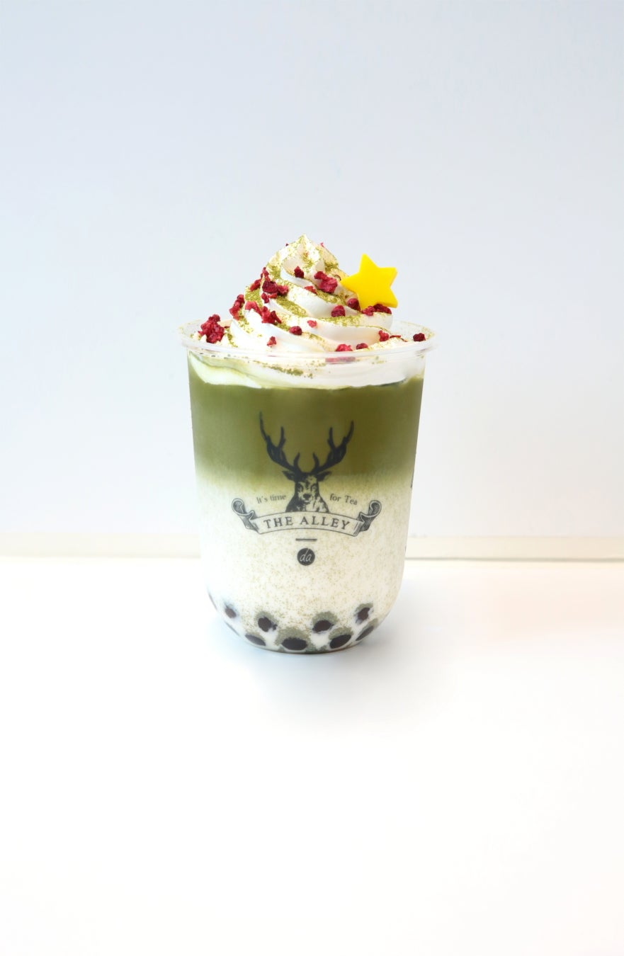 内容:抹茶のほろ苦さを残しつつ、ホワイトチョコシロップ、練乳、ホイップクリームでまろやかでリッチな一杯(タピオカ入り)。