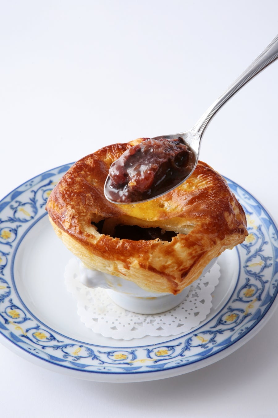 内容:スペイン産赤ワインと野菜で1日漬けた牛頬肉をさらに約2時間ほどじっくり煮込み、パイ包みにして仕上げました。