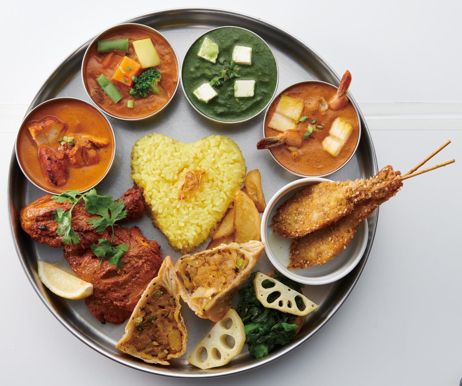 内容:エビのゴマ揚げ、タンドリーチキン、サモサなどに4種のカレーとハート型ライスのペアメニュー。プレーンナン付き。(+¥200でチーズナン、ガーリックナンに変更可能)