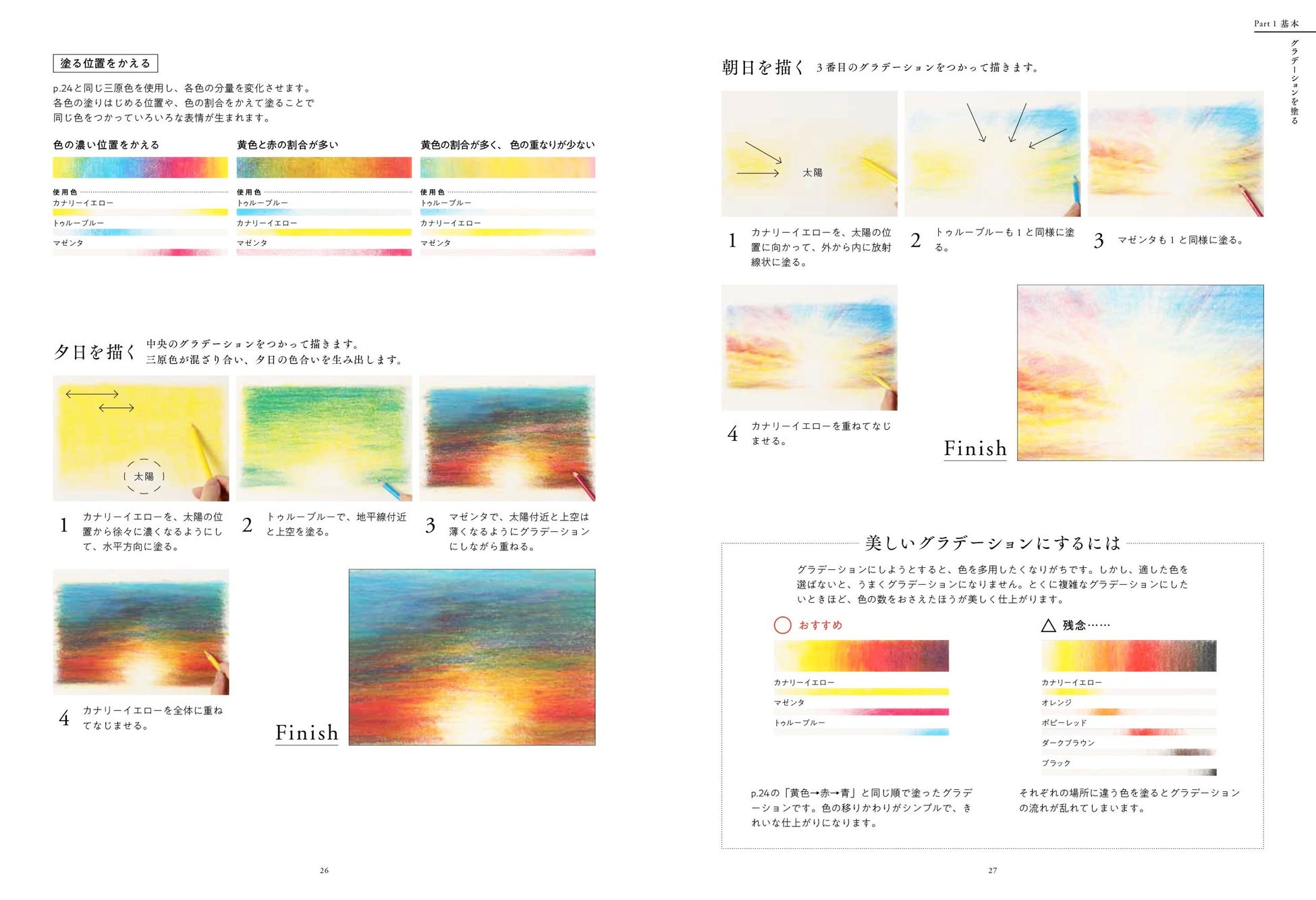あざやかな、あるいは重厚な色彩を表現するには、実はテクニックがあります。あなたも自由にグラデーションをあやつってみましょう。それぞれのグラデーションでつかう色鉛筆もていねいに紹介します。