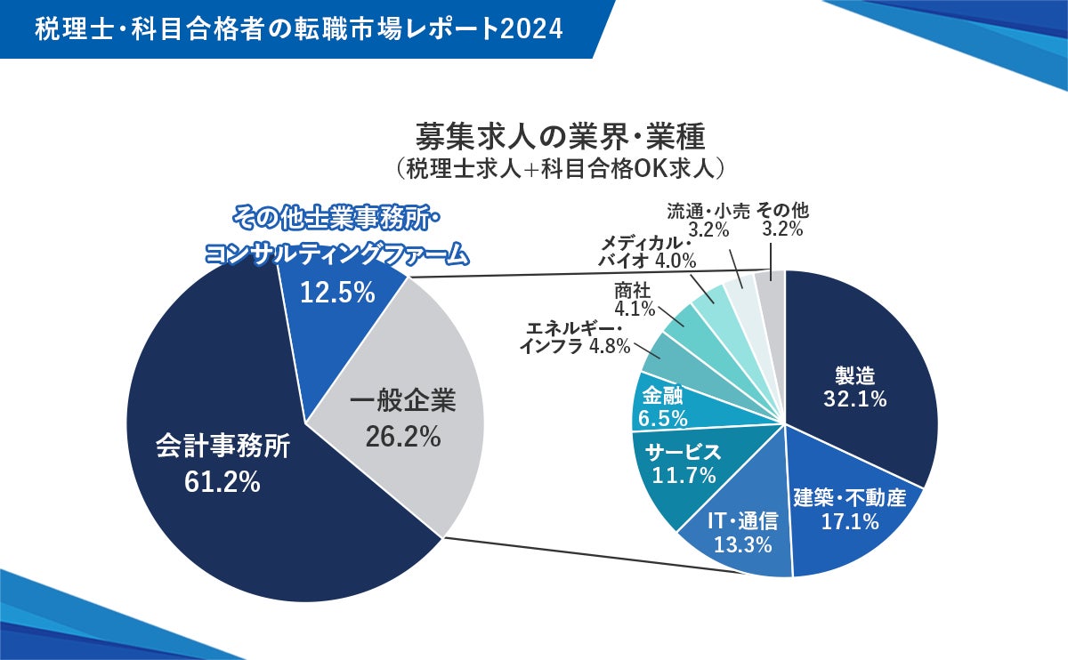 また、募集業種をさらに細かく調査したところ、税理士もしくは科目合格者を募集する求人では、「会計事務所」が全体の「61.2%」、次いで「一般企業」が「26.2%」を占めることが明らかになりました。