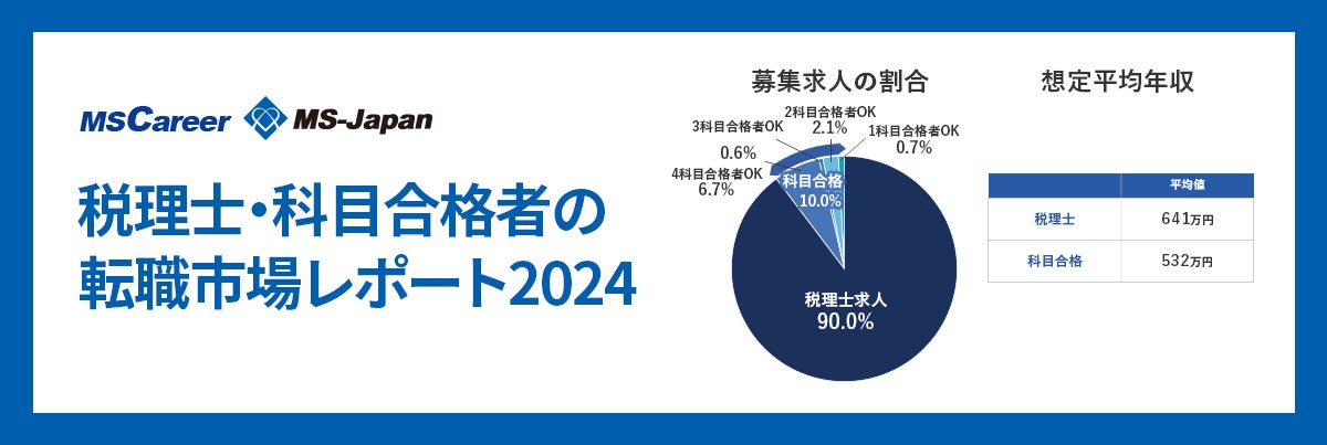 この度、MS-Japanが運営する管理部門・士業の総合転職サービス「MS Career(エムエスキャリア)」は、【税理士・科目合格者の転職市場レポート2024】を発表いたしました。