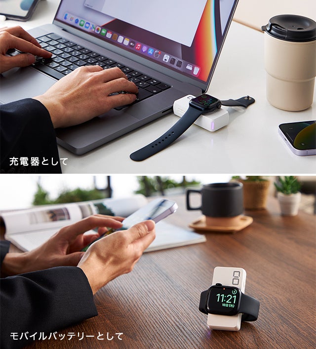 自宅やPC作業をしている際は充電器として、出張やちょっとした外出ではモバイルバッテリーとして使用できる2WAYだからこそ、いつでもどこでもApple Watchを充電可能です。