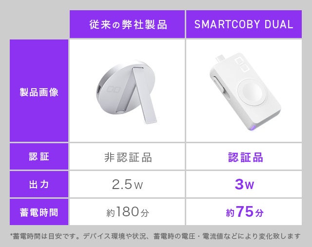 SMARTCOBY DUALは、いつでもどこでも充電ができ、持ち運びに優れたコンパクトさを兼ね備えているからこそAppleWatch充電のベストパートナーになることを確信しております。