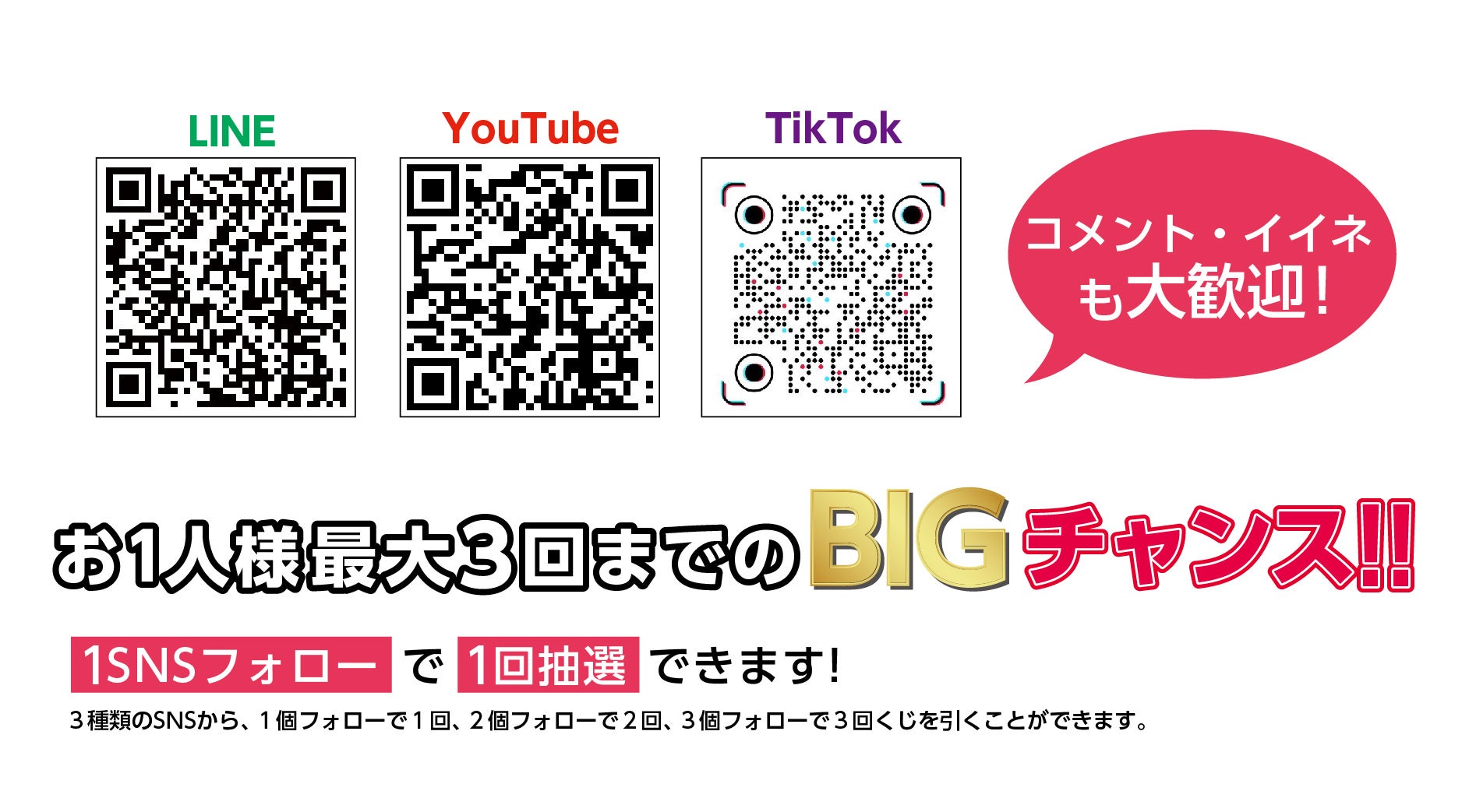 MEISTER.F沖縄ライカム店では、2月1日(水)~2月28日(火)まで、3つ(LINE・TikTok・YouTube)のMEISTER.F公式SNSアカウントから、1つのアカウントフォロー1回で、1度くじ引きが行えるキャンペーンを実施します。