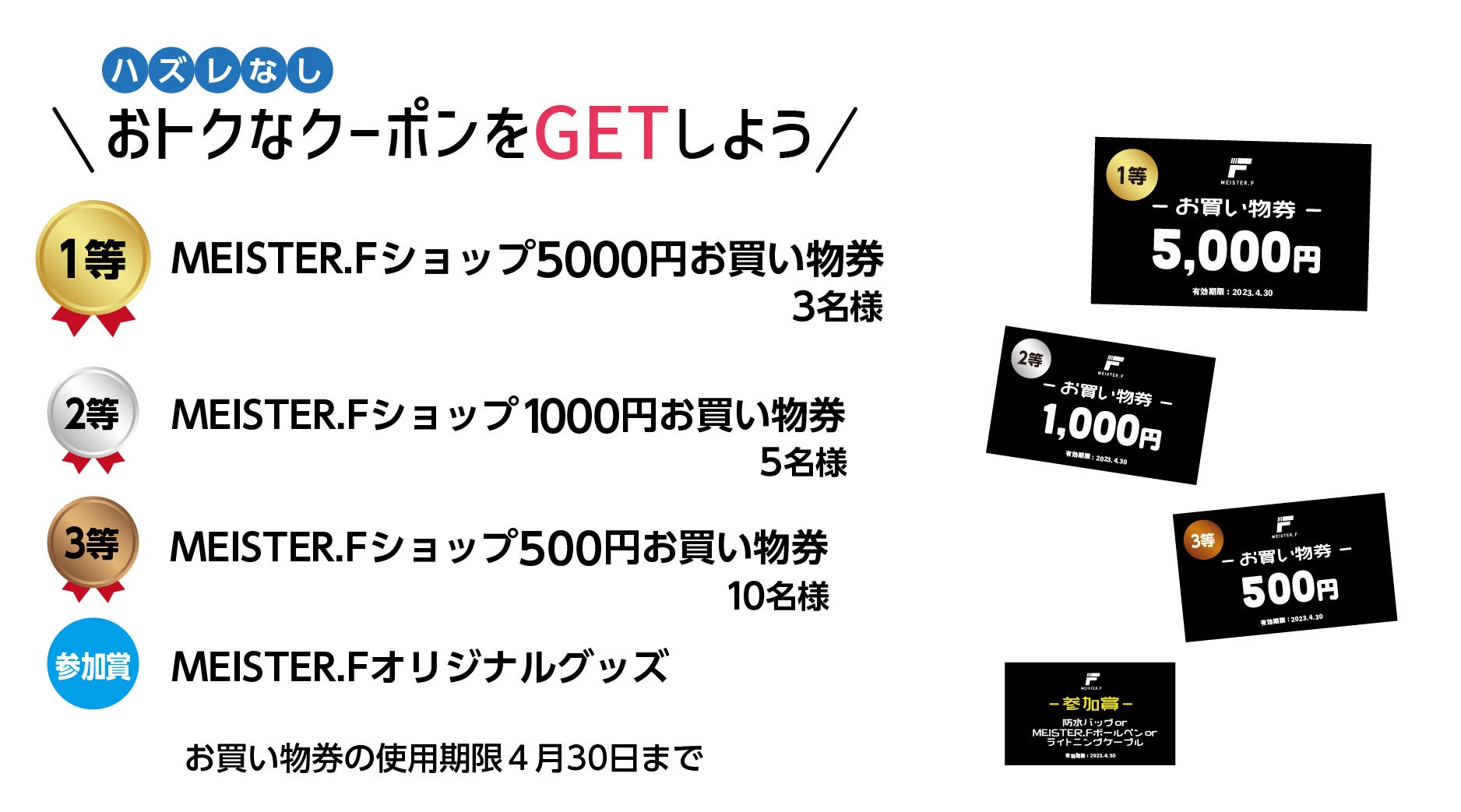 景品は1等~3等はとってもお得なMEISTER.Fストアで使える500円~5,000円のお買い物券、参加賞はMEISTER.Fオリジナルノベルティ(防水バッグ・ボールペン・iPhone認証ライトニングケーブル)の中からお好きなものを1つプレゼントいたします。