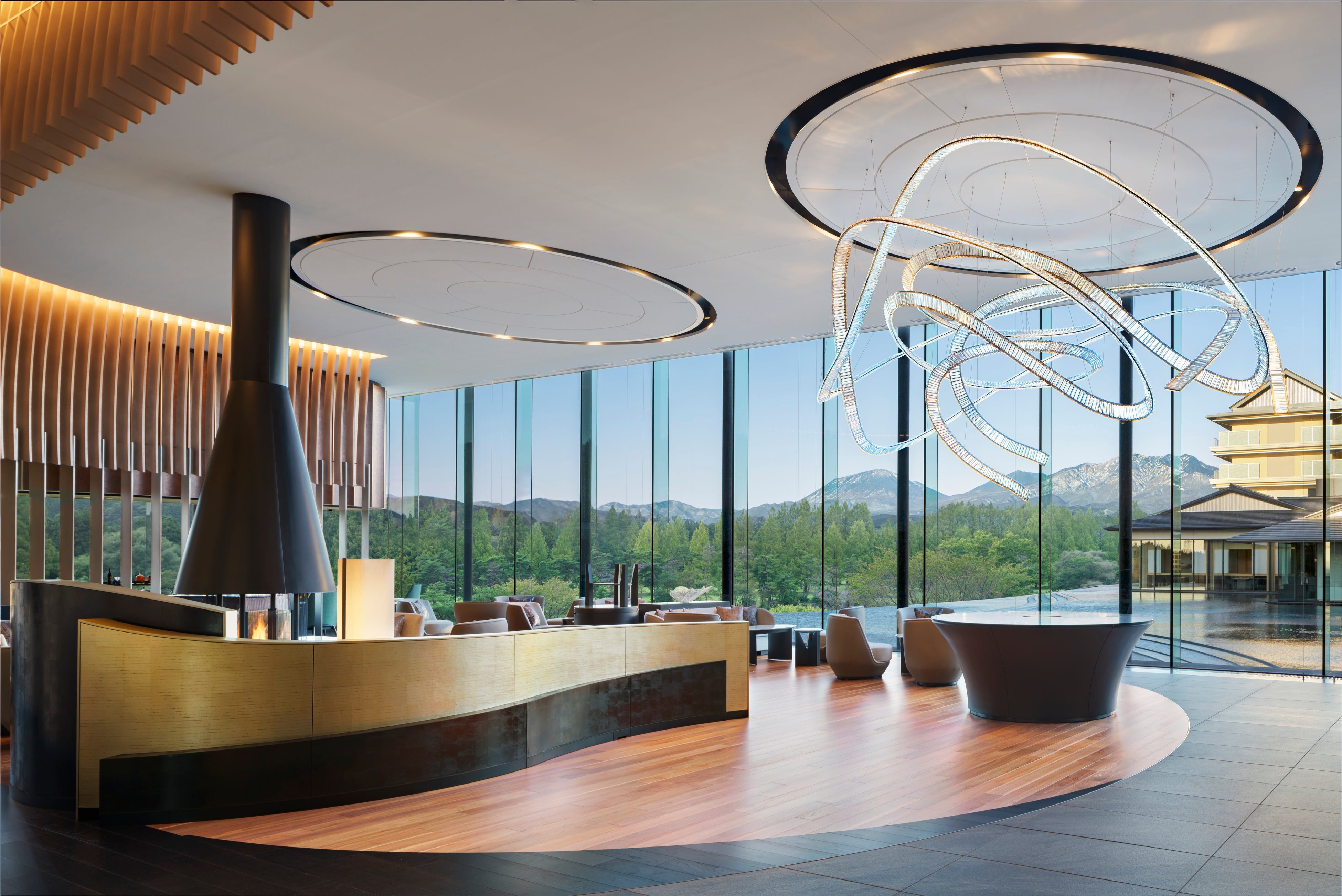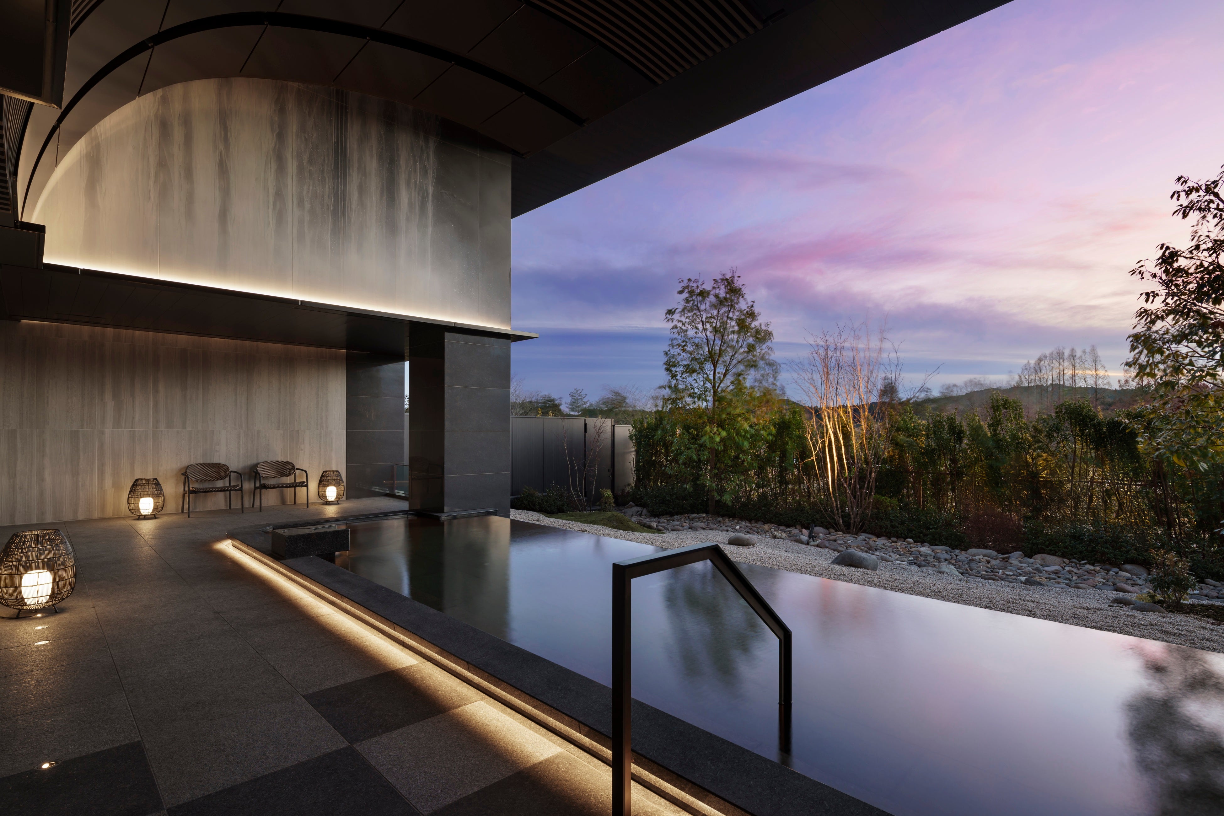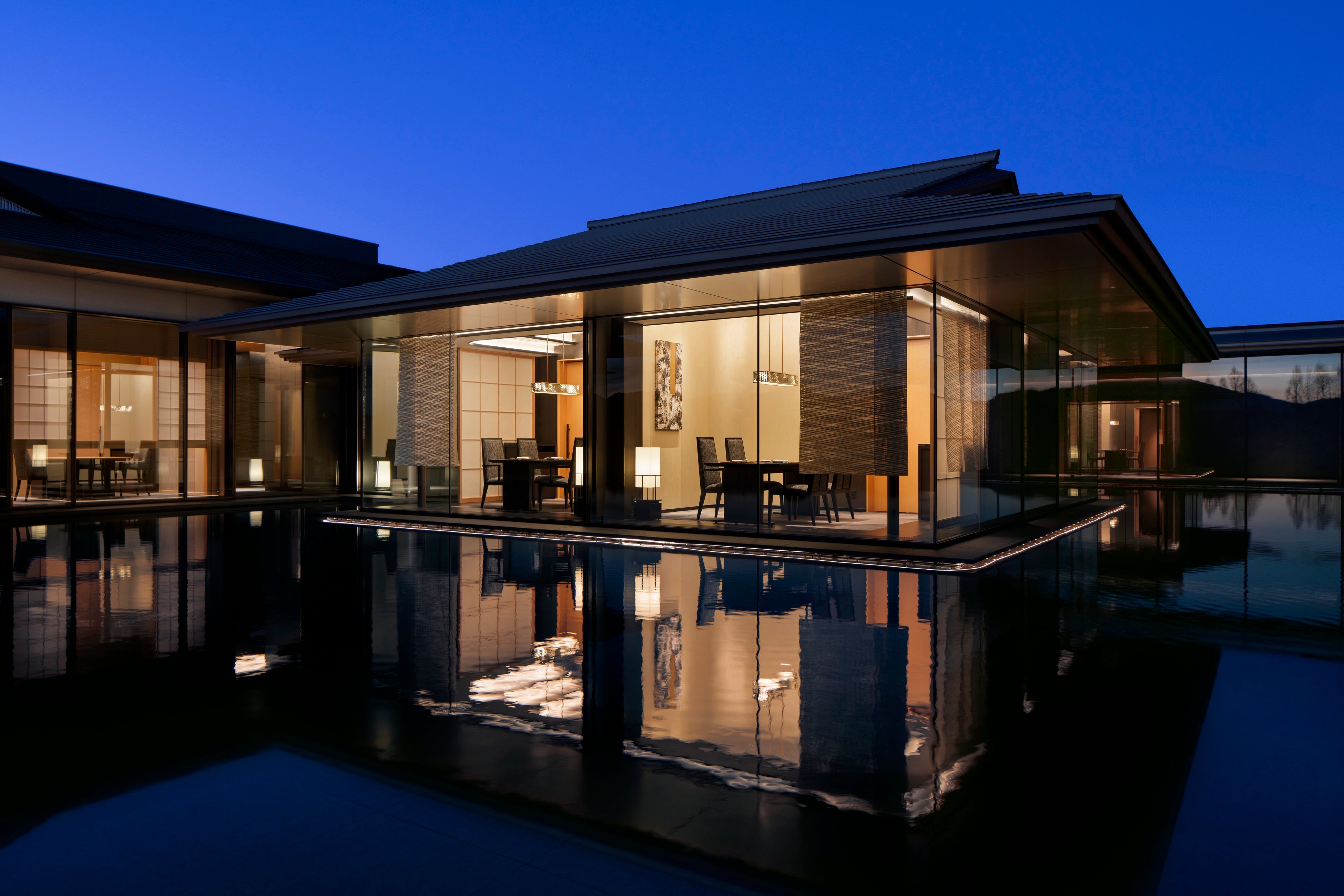 当ホテルは日光の荘厳な自然を背景に、気品ある優雅な“和”をモダンに昇華させたリゾートです。敷地前の鬼怒川と繋がるかのような流水景の主庭が、時の移ろいとともに幻想的に変化し、非日常の空間を演出します。