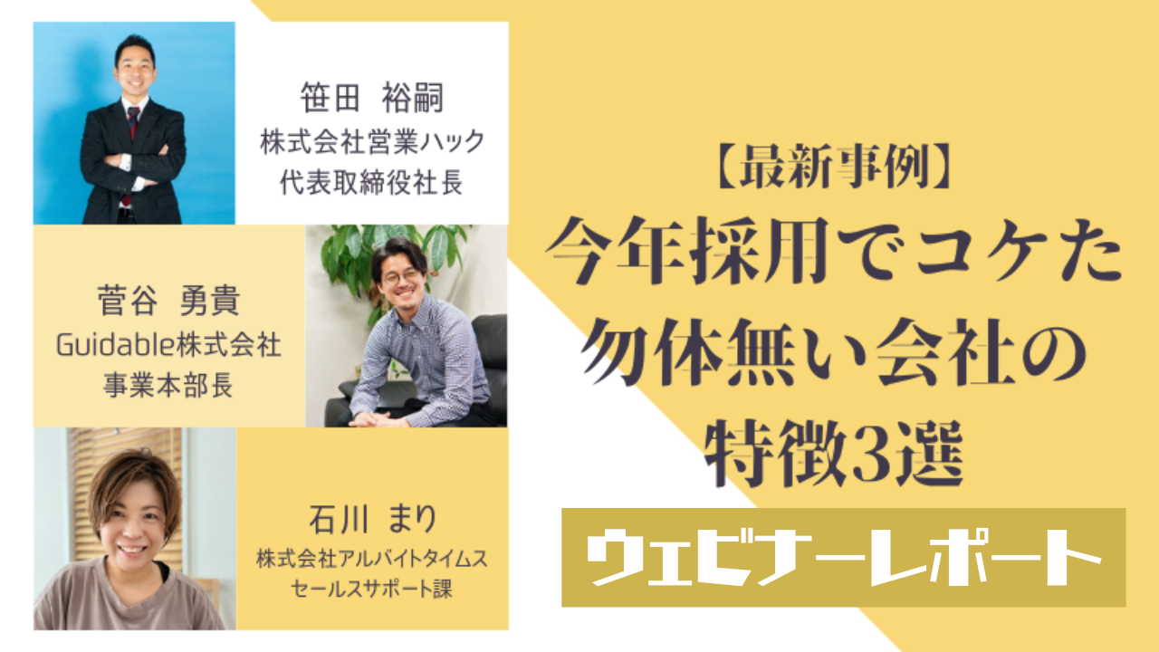 こういった背景をもとに、本セミナーでは、営業ハックの笹田、 Guidableの菅谷様、アルバイトタイムスの石川様の三人で、実体験の失敗談をご紹介し、ご自身の採用活動にエラーがないか?を振り返る場としてこの機会を
