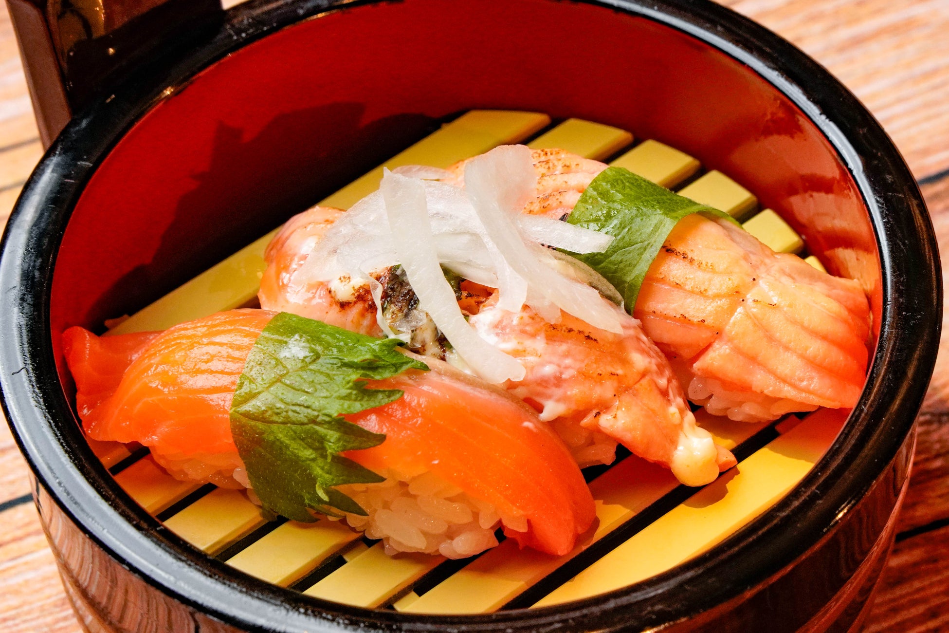 新鮮な地元の魚や当社の仕入れ力を結集した厳選素材を使用した、シンプルで本格的なにぎり寿司。大人気の本マグロや富士天然水サーモン、ヤリイカ、赤エビなど、幅広いお客様に満足いただけるラインナップを1貫99円からのお求めやすい価格で揃えています。また、にぎり寿司のほかに、軍艦や巻きもの、人気のネタの3種盛りなど豊富なメニューをご用意いたしました。