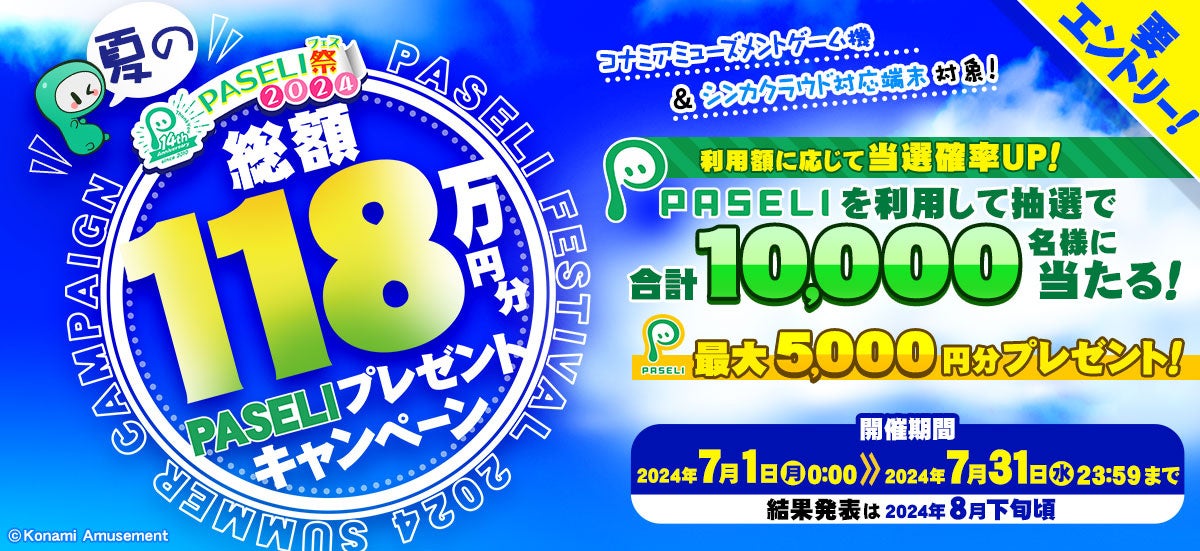 株式会社コナミアミューズメントは、KONAMIが運営する"遊べる電子マネー"「PASELI(パセリ)」を利用すると、抽選で「PASELI」のチャージコードが当たる「夏のPASELI祭2024 (なつのぱせりふぇすにせんにじゅうよん)※1」を7月1日(月)から開始することをお知らせします。