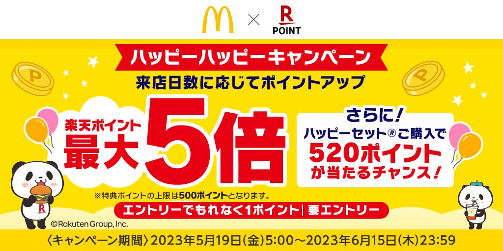 「楽天ポイントカード」、「マクドナルド ハッピーハッピーキャンペーン!楽天ポイント最大5倍」を実施