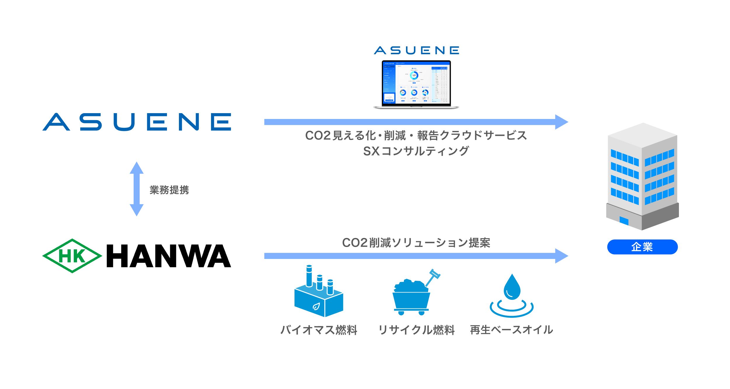 CO2排出量見える化・削減・報告クラウドサービス「ASUENE」と阪和興業の脱炭素ソリューションにより、企業のサプライチェーン全体の脱炭素化を支援します。