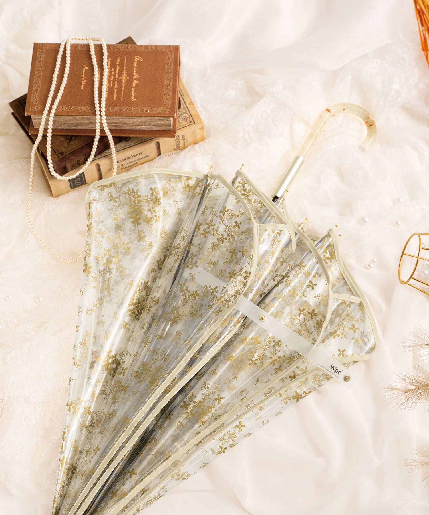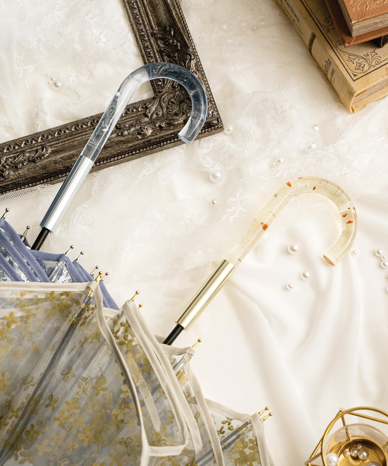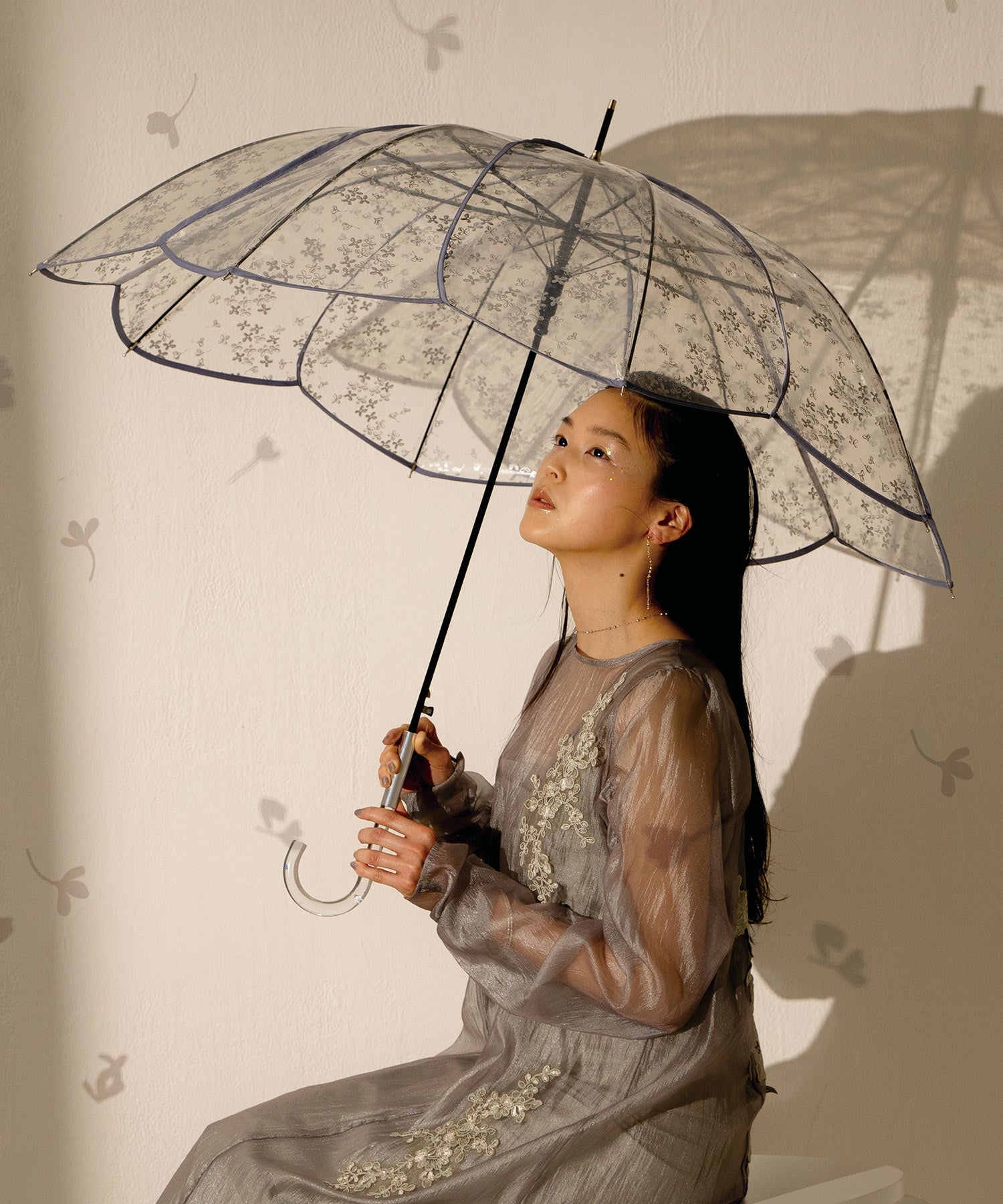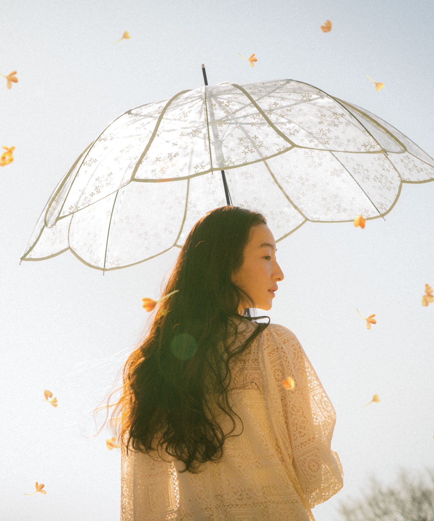 秋の訪れを告げる、可憐で温かみのある"金木犀"と、奥ゆかしく佇む"銀木犀"がモチーフのビニール傘。秋空を舞う花びらをイメージした大人かわいいデザインになっており、生地のフチを彩るパイピングは満開の花のように優雅な曲線を描きます。持ち手の色合いは、それぞれの雰囲気に合わせたゴールド、シルバーで上品に仕上げました。