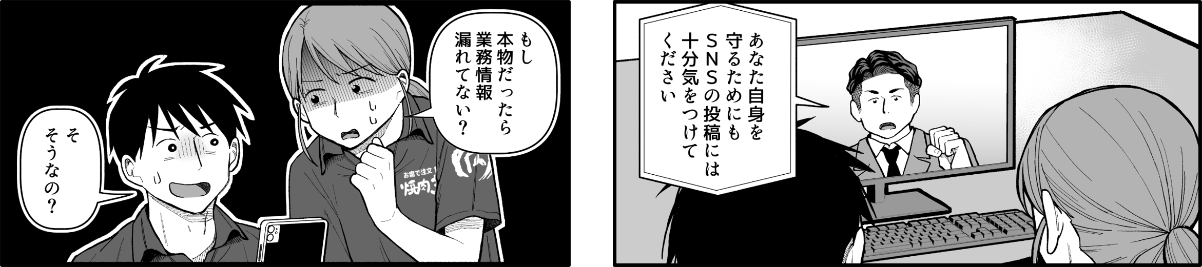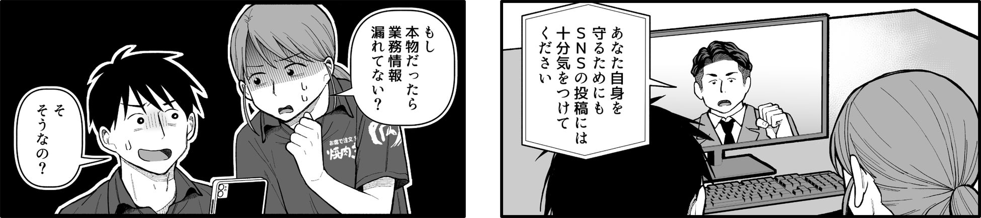 従業員のSNS利用時に関するトラブルについては、近年ニュースなどで目にする機会が増え、当社としてもさらなる対策を検討しておりましたが、業界の特性上パート・アルバイトの雇用が多いため、SNSリテラシー教育のハードルが高いことが課題でした。この度の制作にあたり、コミックラーニングの制作スタッフより「全スタッフの負担になることなくどのようにメッセージを届けるか」を丁寧にヒアリングしていただき、SNSの取り扱いにおける注意喚起とともに、“スタッフを守っていく”という当社のメッセージを取り入れたオリジナルコミックの制作が実現しました。