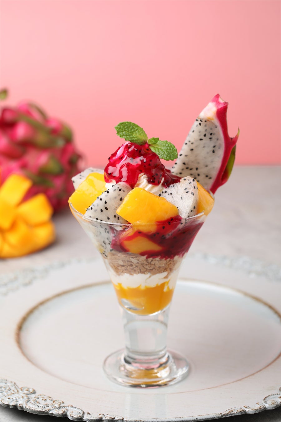 ごろっと大粒のマンゴーとさっぱりとした風味のドラゴンフルーツをたっぷりと使った、バランスの取れた飽きのこない味わいのトロピカルパフェです。トロッとしたマンゴーソースにホイップクリームとさくさく食感のフィアンティーヌを重ね、バニラアイス、サワーグルトアイス、マンゴーとドラゴンフルーツの果実、甘酸っぱいドラゴンフルーツソースをトッピングし、見た目も華やかに仕上げました。