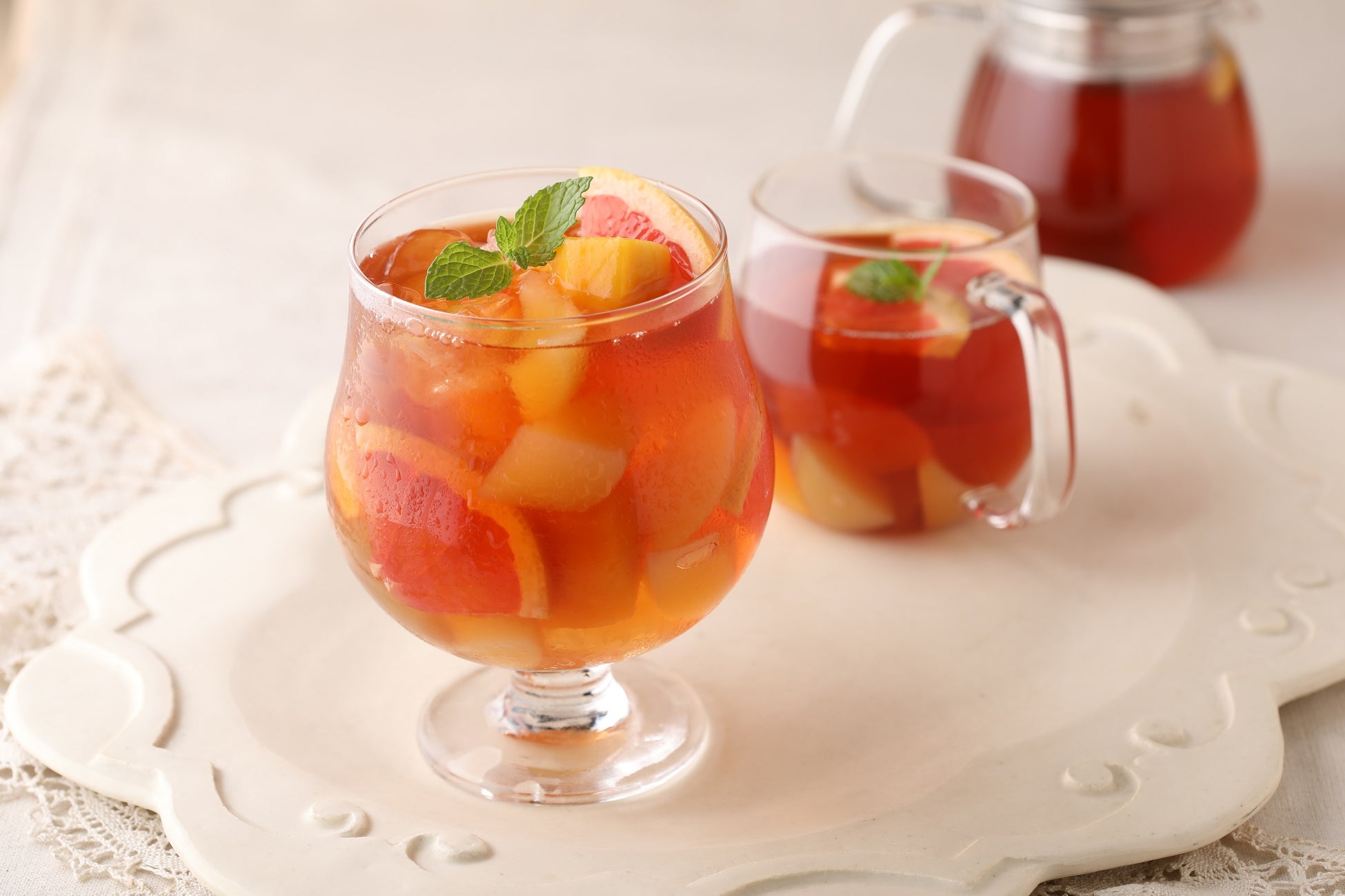 甘く爽やかなピーチの香りが特徴のフレーバーティーに、相性の良い3種のフルーツをセレクト。みずみずしい白桃とフルーティーなマンゴー、ルビーグレープフルーツで彩りを添えています。さらに果実感あふれる白桃ソースと「ピーチ&ローズヒップ」のフレーバーティーを使った自家製のティーシロップを加え、すっきりと爽やかな味わいに仕上げました。