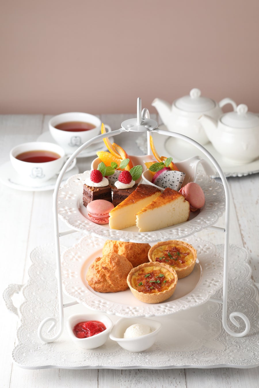 季節のケーキやオリジナルスコーンを紅茶で味わう贅沢な「アフタヌーンティーセット」がさらにおいしくリニューアルしました。上段には2種類のケーキに加え、新たにマカロンと季節のフルーツ盛りが並び、下段はスコーンに加え、新たに玉ねぎとベーコンのキッシュが並びます。スコーンは、お好みでクロテッドクリームやいちごジャムをつけてお召し上がりください。ドリンクは全てのドリンクメニューからお選びいただけます。