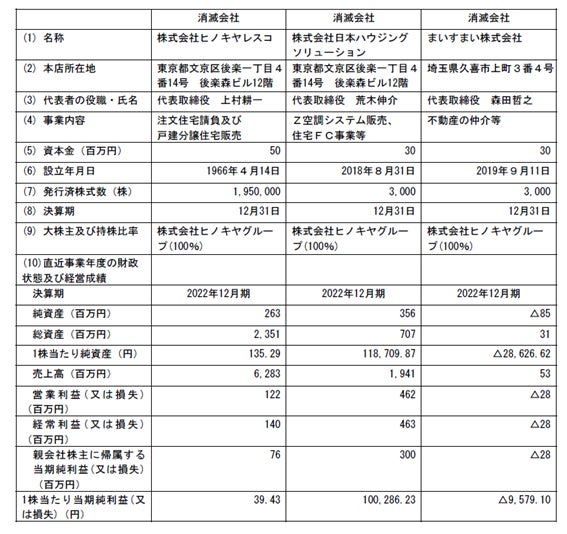 ヒノキヤグループを存続会社、その子会社6社を消滅会社とする吸収合併方式とし、子会社6社は解散いたします。