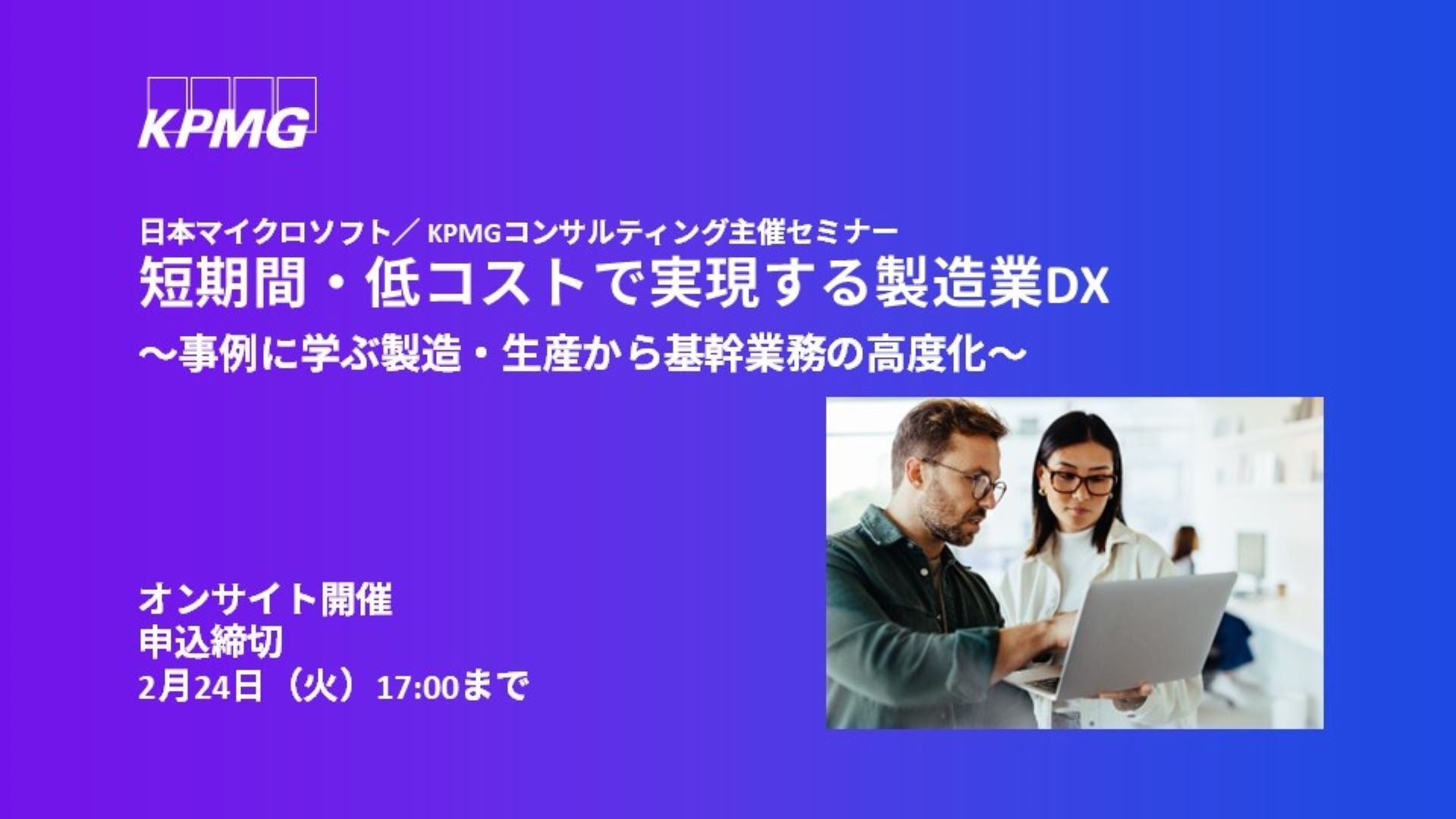 本セミナーでは、日本マイクロソフトより最新ソリューションを活用した製造業向けDXの進め方を、短期間・低コストで実現するためのポイントとともに解説します。また、デンソーより生産現場改革を中心とした事例をご紹介いただき、KPMGコンサルティングからは最新DXの考え方やトレンドについて解説します。新たにDXを担当することになった方はもちろん、DXのキャッチアップを進めたい経営層の方にもご活用いただける機会です。