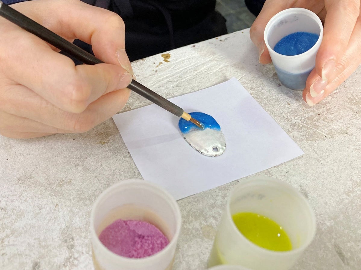 純銀の板の上にお好みの色をつかいペンダントやストラップなどを制作します。