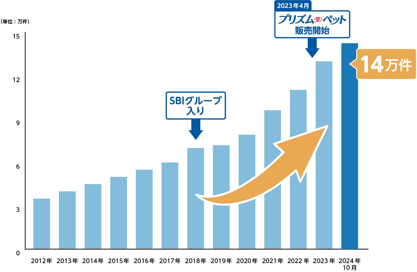 SBIプリズム少額短期保険株式会社(本社:宮城県仙台市、代表取締役社長:遠藤 匡、以下「SBIプリズム少短」)のペット保険保有契約件数が、2024年10月末時点で14万件を突破いたしました。