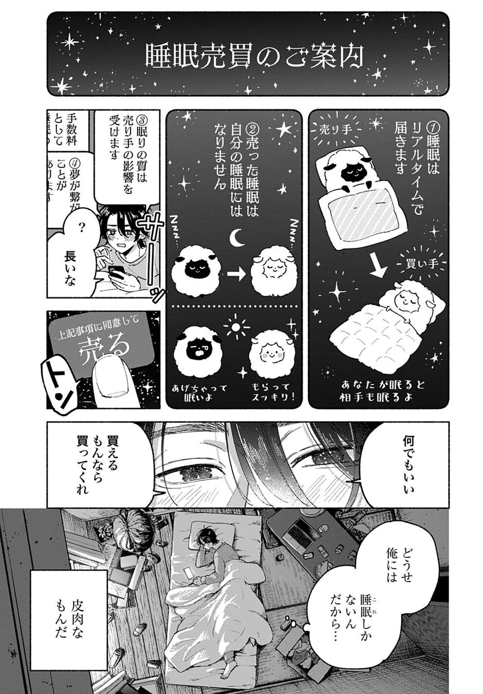 「世界で一番睡眠時間が少ない国」、日本。そんな寝不足大国に生まれながらも、諸星真夜は、自堕落でよく眠る、寝不足とは無縁な生活を送る"無職"であった。そんなある日、真夜の携帯に見覚えのない「睡眠売買アプリ」が入っていた。疑い半分で使用してみる真夜だったが、なんと実際に睡眠を売り、お金を稼ぐことができ……。これは、いつまでも明けない深い夜に、明日を灯す物語。