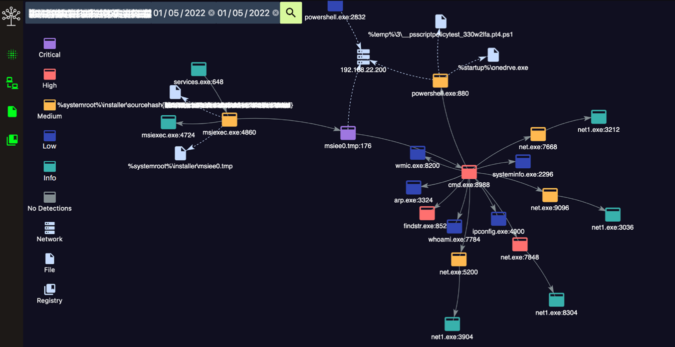 Detectree はログデータを構造化し、検出された疑わしいアクティビティと、その検出に関連するプロセス/宛先ネットワーク/ファイル/レジストリキーとの関係を可視化することにより、ブルーチームが調査作業を省力化できるように設計されています。イベントの繋がりを再構築するためにテキストとして表現されたデータを手作業で分類するのではなく、インシデントレスポンス担当者は視覚化されたものを見て、相互作用/親子関係/プロセスインジェクションなどの繋がりだけでなく、繋がりの性質を確認することができます。可視化により、インシデントレスポンス担当者は検出された状況をすばやく確認し、そのデータをシンプルで直感的な方法で関係者と共有し、情報を必要とするすべての人がアクセスできるようにすることができます。