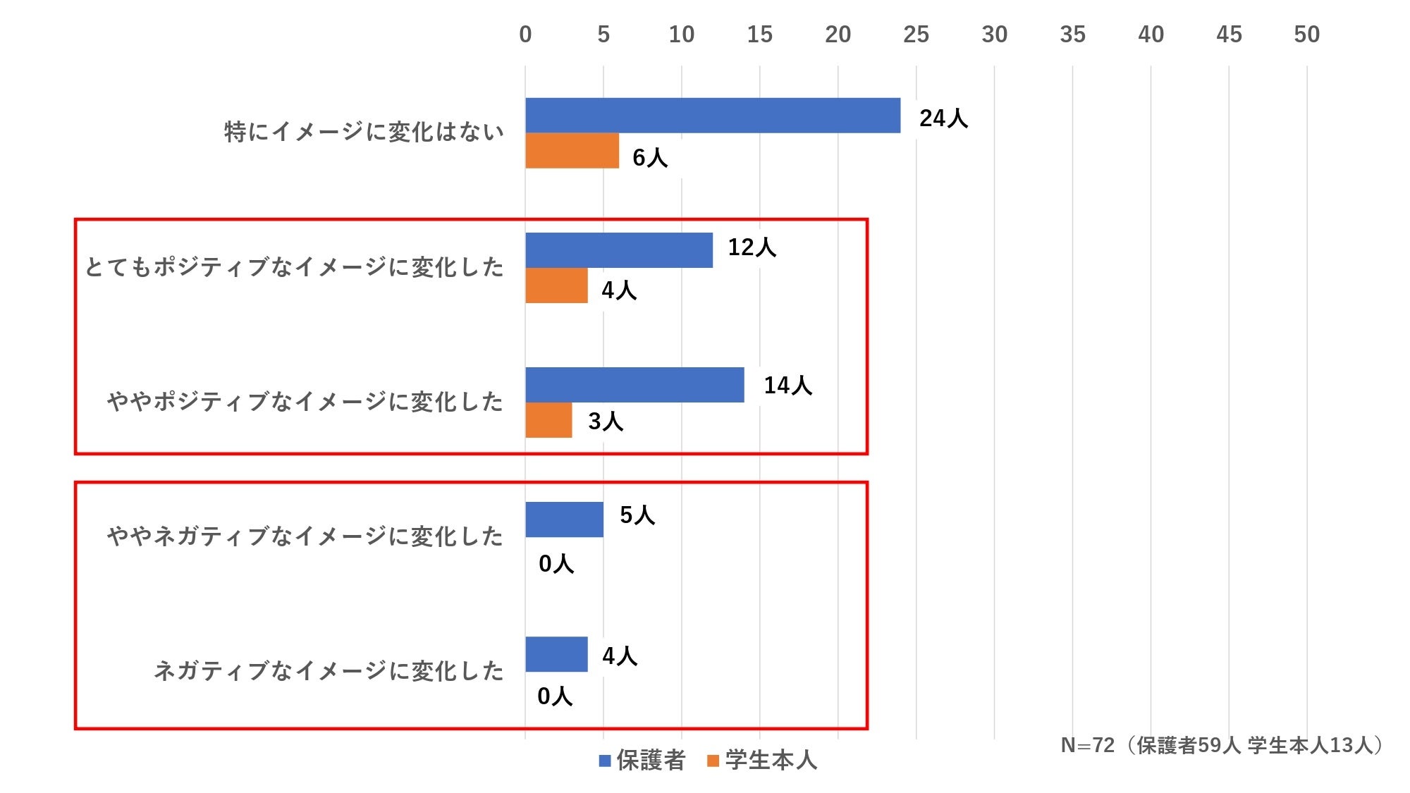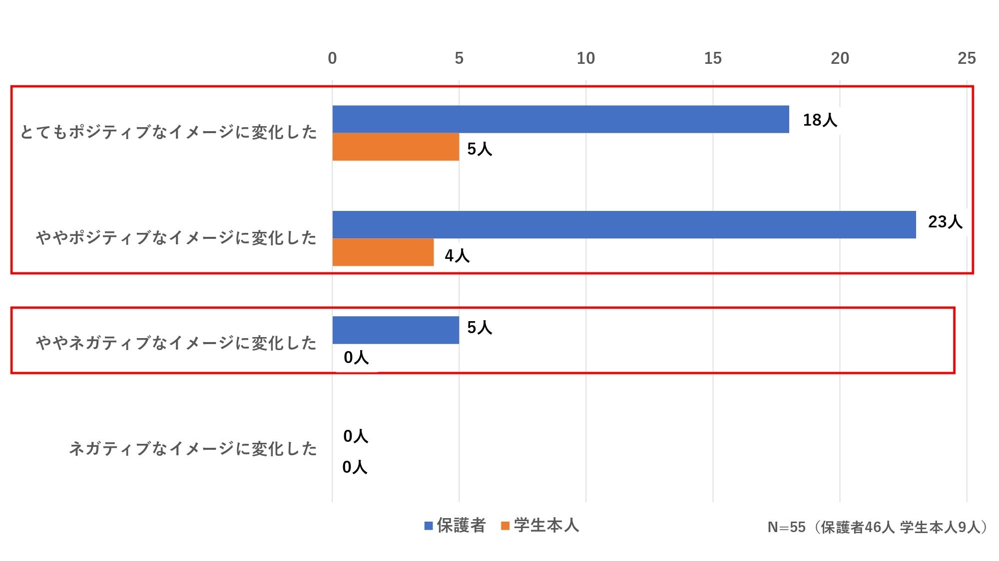 保護者は41人、学生本人においては9人全員が「ポジティブなイメージに変化した」と回答。