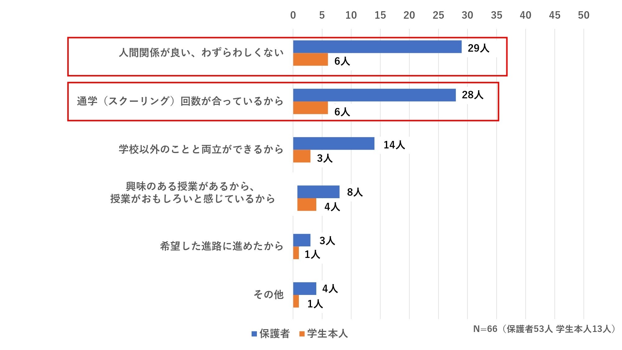 保護者は53人、学生本人は13人全員が「通信制高校に進学してよかった」と回答。