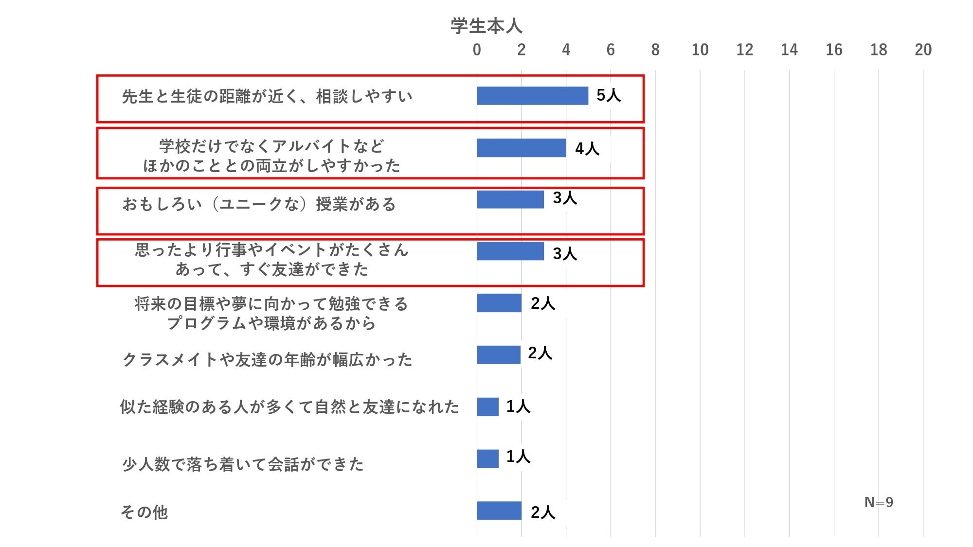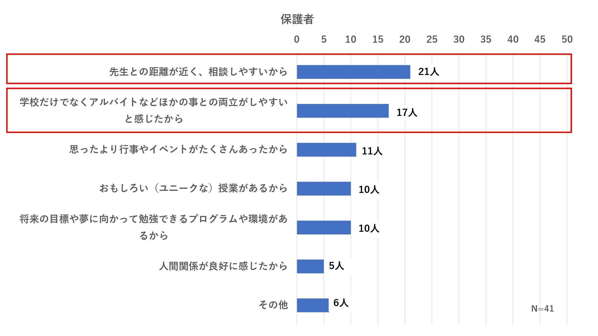 保護者、学生本人回答ともに「先生との距離が近く、相談しやすいから」「学校だけでなくアルバイトなどほかの事との両立がしやすいと感じたから」という理由に加え、さらに学生本人の回答では「おもしろい(ユニークな)授業がある」「思ったより行事やイベントがたくさんあったから」という理由が上位に。