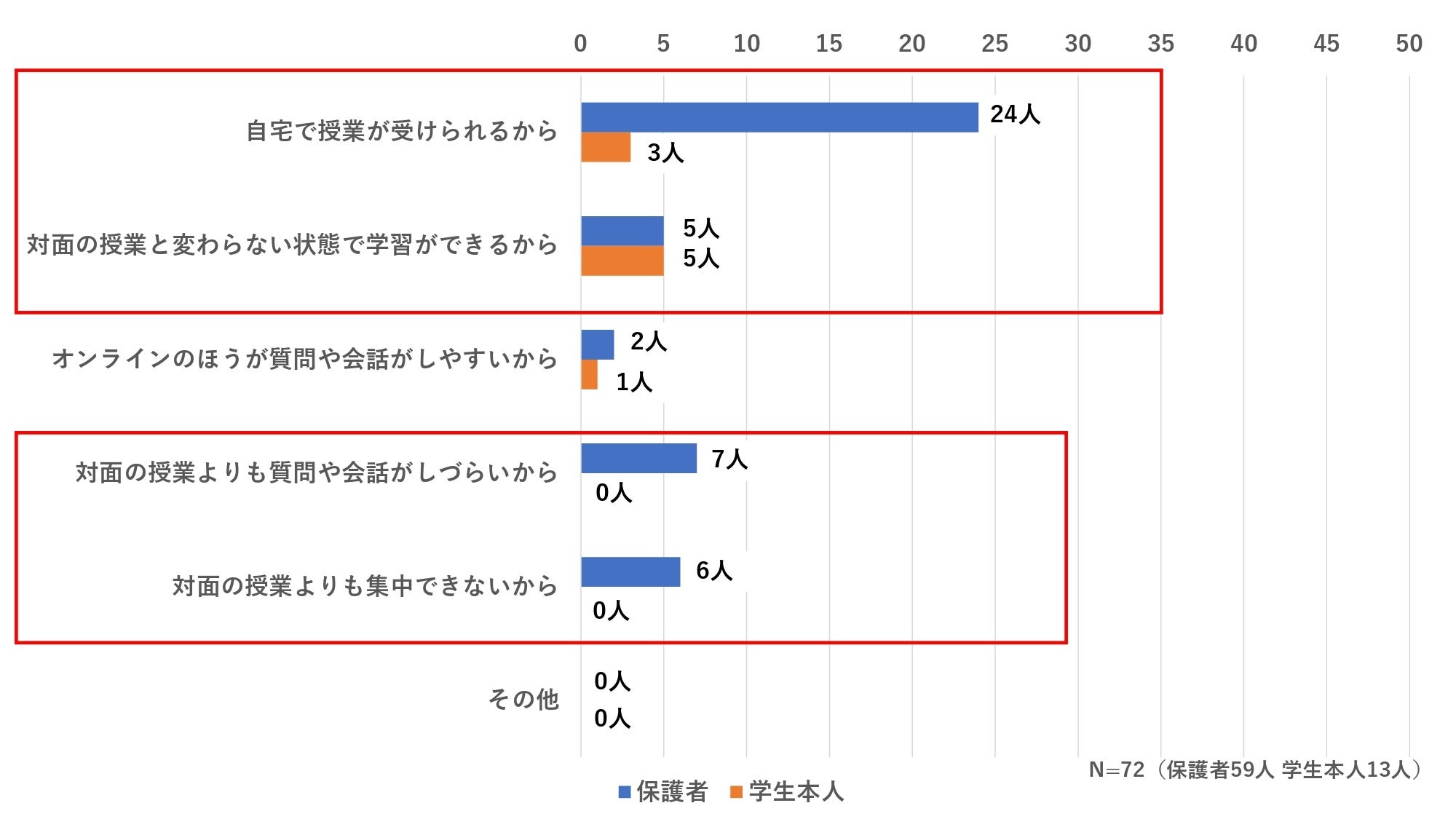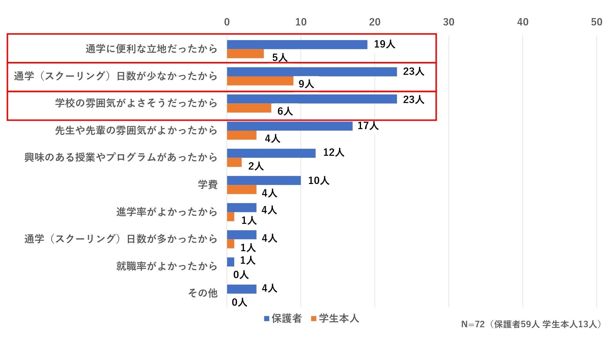 保護者の回答・学生本人の回答ともに、上位の理由は「通学(スクーリング)回数が合っているから」