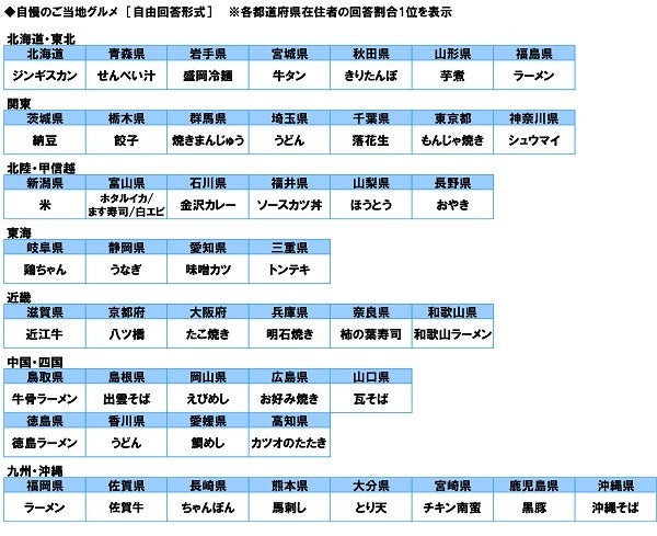 各都道府県の在住者(各都道府県100名)に、自県の自慢のご当地グルメを聞いたところ、北海道では「ジンギスカン」、青森県では「せんべい汁」、岩手県では「盛岡冷麺」、宮城県では「牛タン」、秋田県では「きりたんぽ」、山形県では「芋煮」、栃木県では「餃子」、群馬県では「焼きまんじゅう」、埼玉県では「うどん」、東京都では「もんじゃ焼き」、石川県では「金沢カレー」、福井県では「ソースカツ丼」、山梨県では「ほうとう」、長野県では「おやき」、岐阜県では「鶏ちゃん」、静岡県では「うなぎ」、愛知県では「味噌カツ」、三重県では「トンテキ」、大阪府では「たこ焼き」、兵庫県では「明石焼き」、奈良県では「柿の葉寿司」、鳥取県では「牛骨ラーメン」、島根県では「出雲そば」、岡山県では「えびめし」、熊本県では「馬刺し」、大分県では「とり天」、宮崎県では「チキン南蛮」といった回答が挙げられました。(図4)