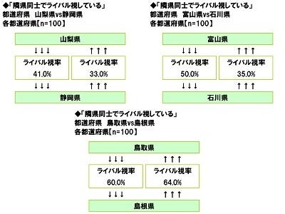 ◆「埼玉県」vs「千葉県」、「茨城県」vs「栃木県」、「山梨県」vs「静岡県」、「富山県」vs「石川県」、「鳥取県」vs「島根県」はお互いにライバル視