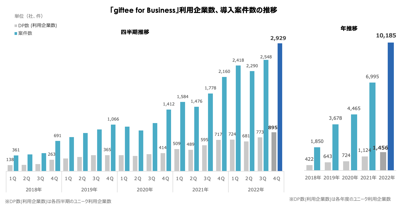 2023年2月に発表した2022年の「giftee for Business」年間利用企業数は1,456社(前年比+29.5%)、年間導入案件数は10,185件(前年比+45.6%)であり、利用企業数の増加とともにリピート率の向上がうかがえる結果となりました。それらの要因の一つとして「giftee Box®」「えらべるPay®」の推進による、新たな業界や用途、領域への開拓が挙げられます。業界開拓では、既存の保険・金融・インターネット・不動産業界などに加え、個人向けの自社商材を持つメーカーや、公益性の高さが求められるインフラ、公営競技、自治体など、特定業界に偏ることなく、デジタルギフト導入が加速する一年となりました。