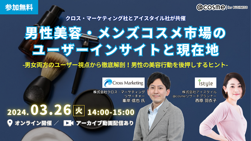 株式会社アイスタイル(代表取締役社長 :遠藤 宗)は、2024年3月26日(火)に、ウェビナーイベント『男性美容・メンズコスメ市場のユーザーインサイトと現在地』を開催することをお知らせいたします。