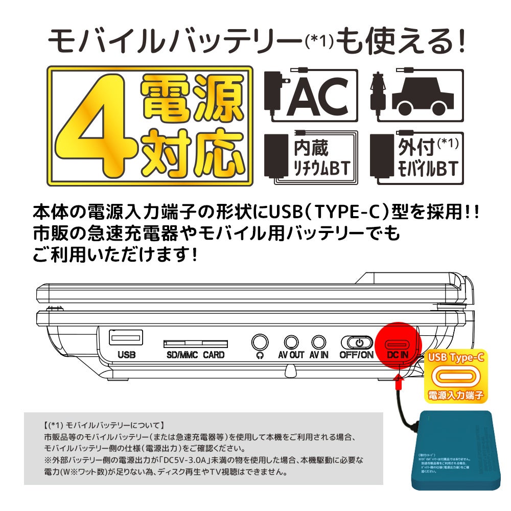 家庭用AC電源、車用DCアダプター、内蔵バッテリー、外付モバイルバッテリー(別売)の4種類の電源に対応。