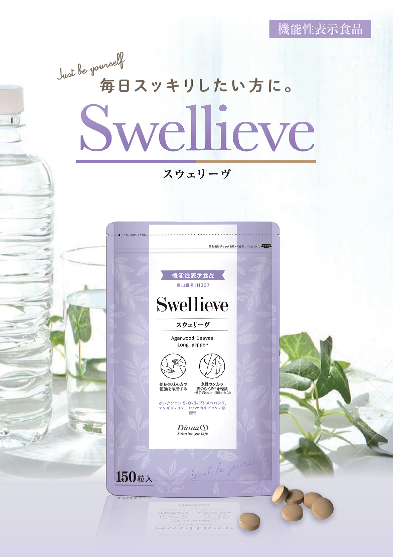 ダイアナでは、美と健康を提供する企業としてインナーからアプローチする服用タイプの商品も多く取り扱っています。新商品の「スウェリーブ」は、すっきりとした毎日をサポートするために開発された機能性表示食品です。