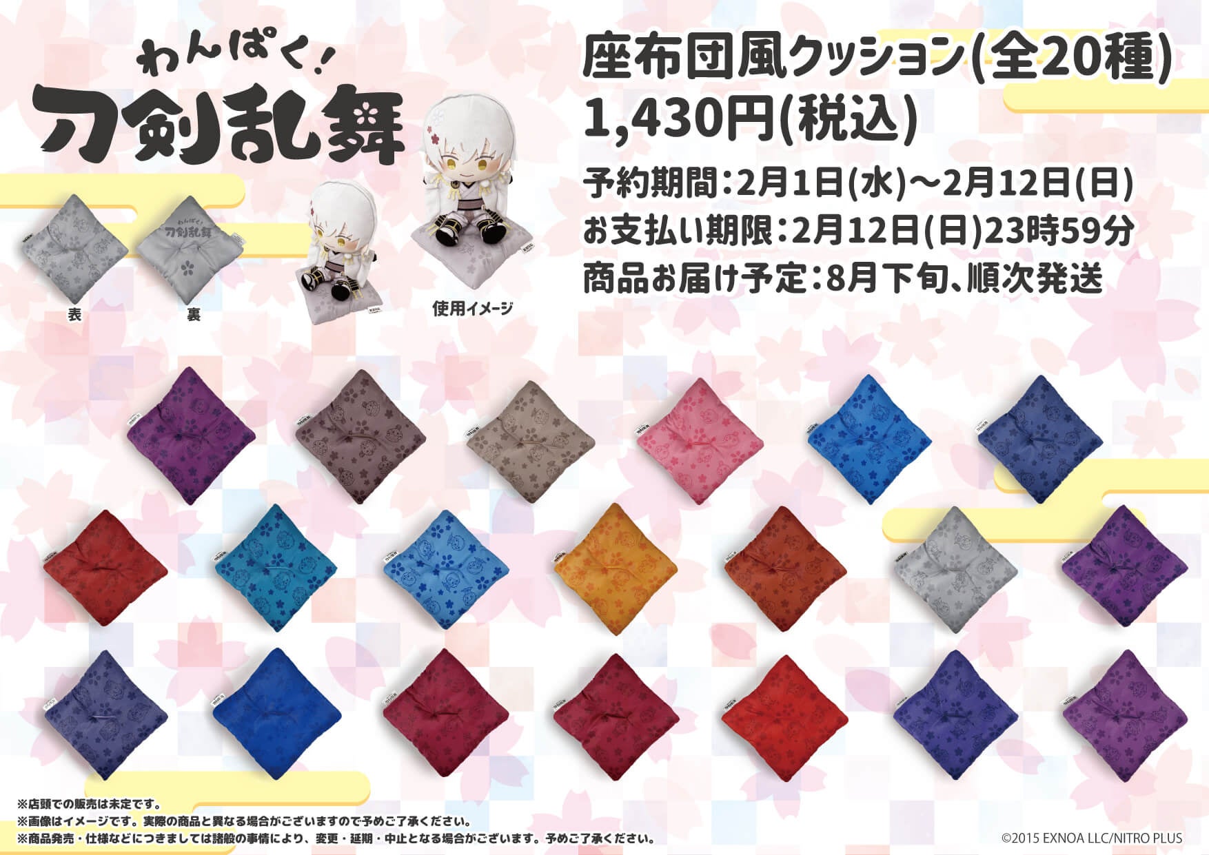 さらにぬいぐるみを座らせてあげるとかわいさが増す「座布団風クッション」第四弾の販売と、第一弾ぬいぐるみ&「座布団風クッション」第一弾~第三弾の再販もスタート。『わんぱく!刀剣乱舞』第四弾のぬいぐるみとあわせてチェックしてみてください♪