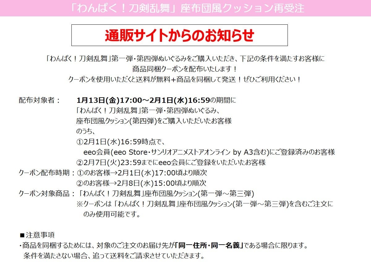 また『わんぱく!刀剣乱舞』第一弾・第四弾のぬいぐるみをご購入いただいた対象のお客様に商品同梱クーポンを配布中です。