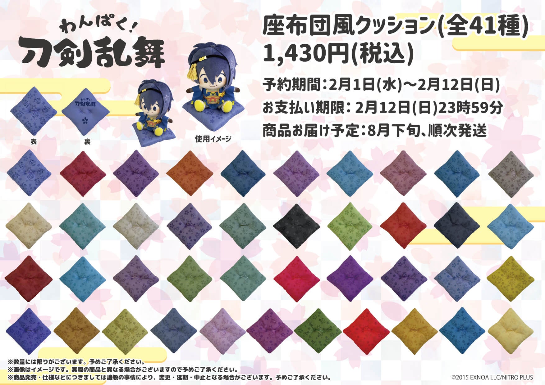 『わんぱく!刀剣乱舞』第一弾~第三弾の「座布団風クッション」の再販も決定しました。桜と刀剣男士がデザインされた可愛い座布団を、ぬいぐるみと一緒にぜひゲットしてください!