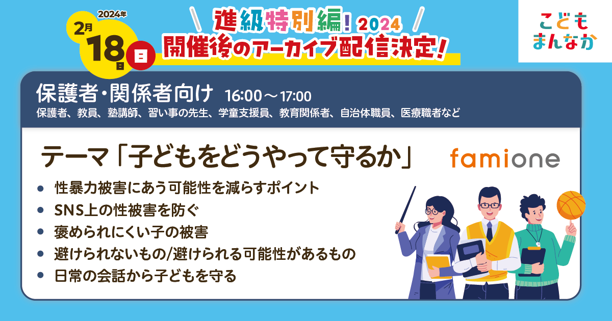 今回多くのご要望にお応えし、「子どもをどうやって守るか」がテーマの保護者・関係者向けの16時~17時の部について、期間限定で開催後アーカイブ配信が決定いたしました!
