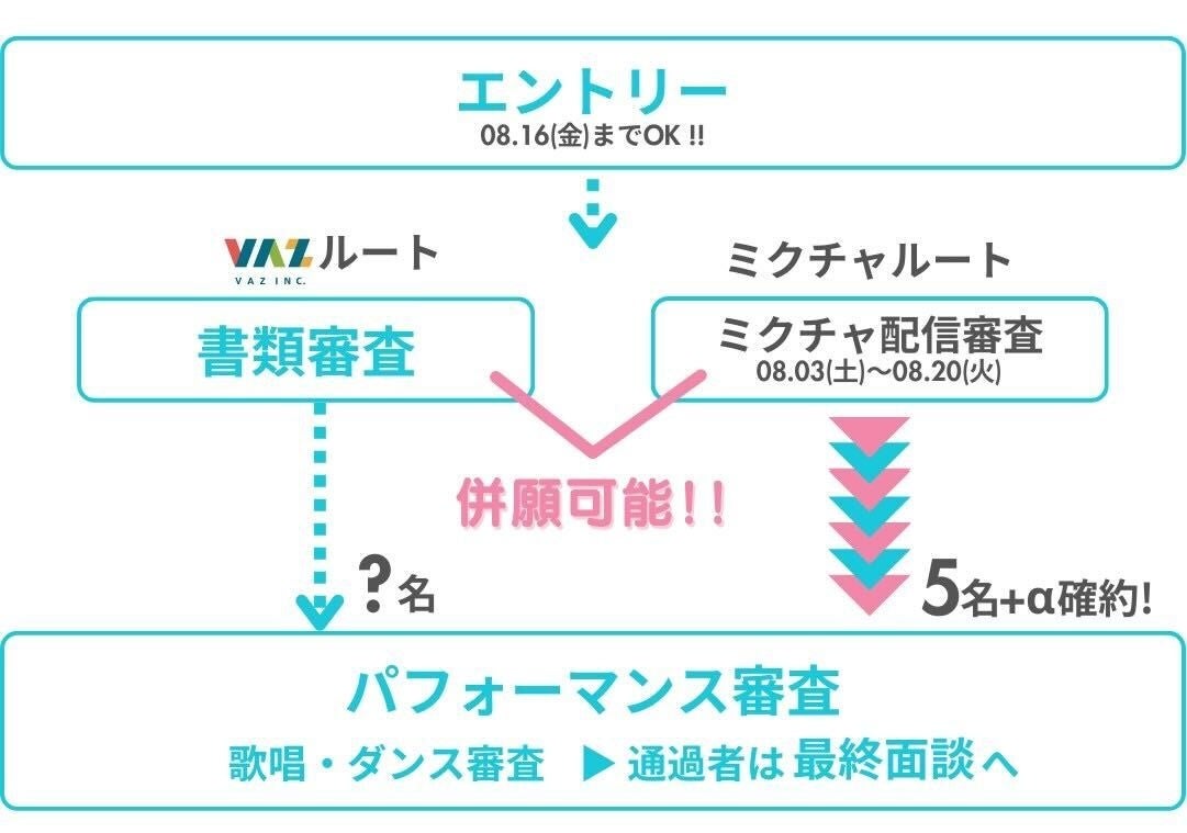 「VAZ NEW アイドル発掘オーディション」は書類審査・ミクチャ配信オーディションからそれぞれ応募可能。書類審査は2024年7月26日(金)~8月16日(金)、ミクチャ配信オーディションは8月3日(土)~8月20日(火)20:00の間で応募可能となります。