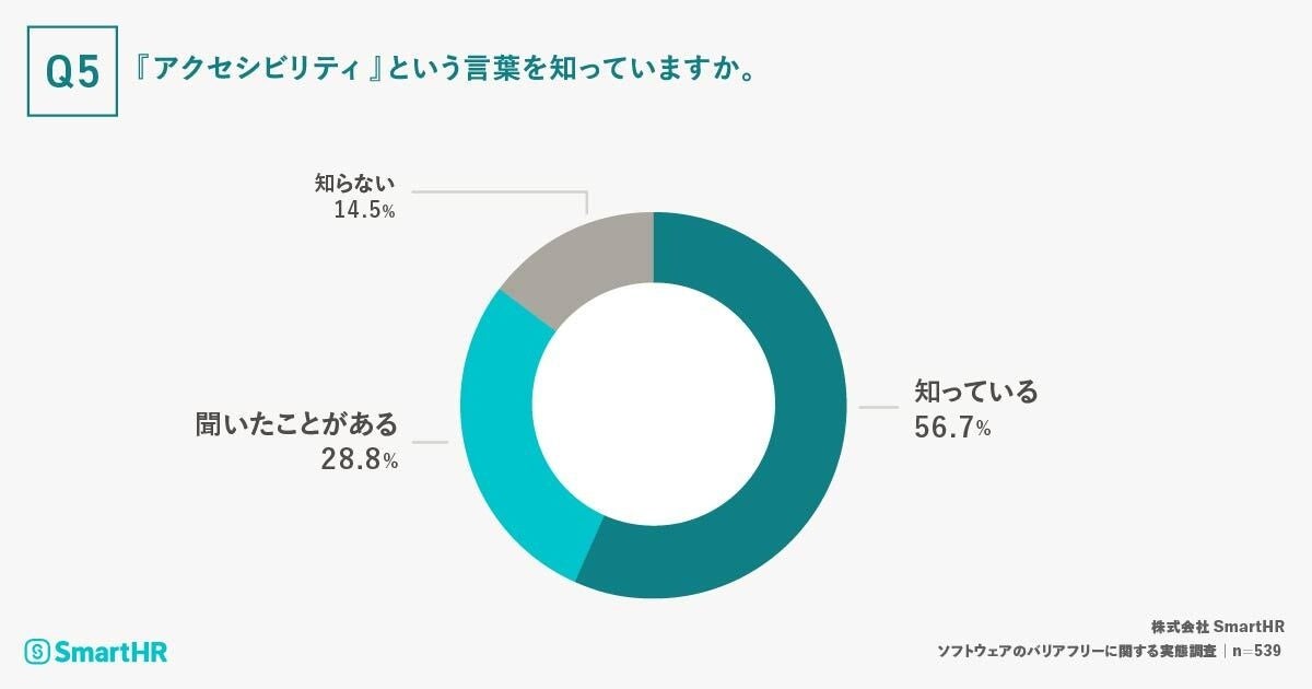 「『アクセシビリティ』という言葉を知っていますか。」と質問したところ、「知っている」が56.7%、「聞いたことがある」が28.8%という回答となりました。