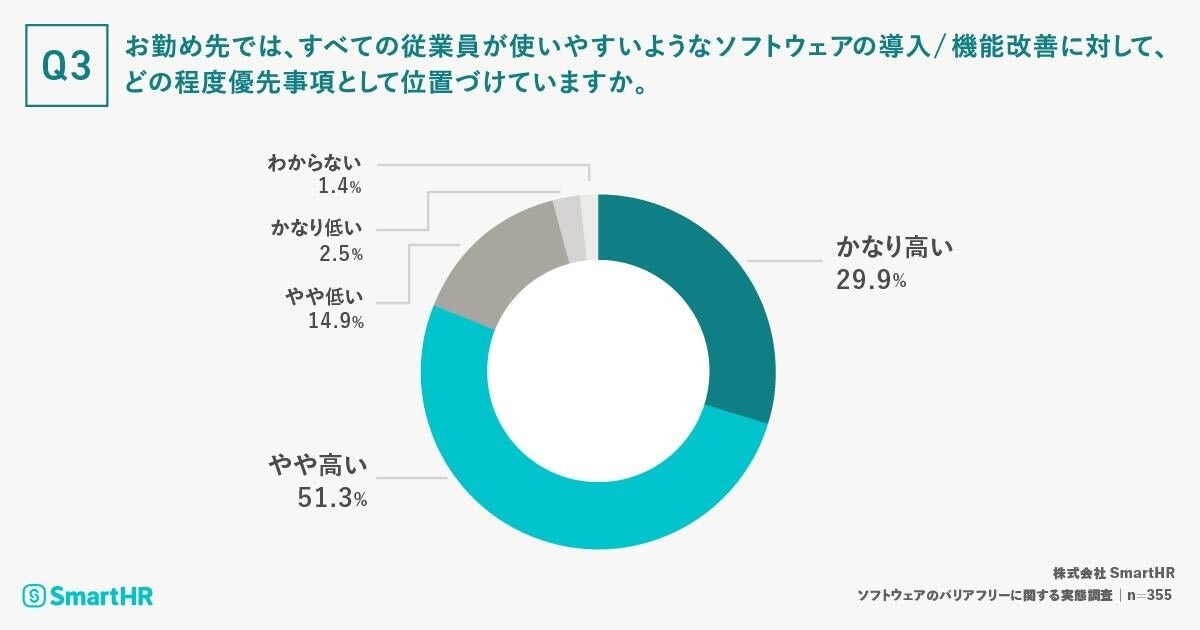 (2)で「すべてのソフトウェアに備わっている」「一部のソフトウェアにのみ備わっている」と回答した方に、「お勤め先では、すべての従業員が使いやすいようなソフトウェアの導入/機能改善に対して、どの程度優先事項として位置づけていますか。」と質問したところ、「かなり高い」が29.9%、「やや高い」が51.3%という回答となりました。