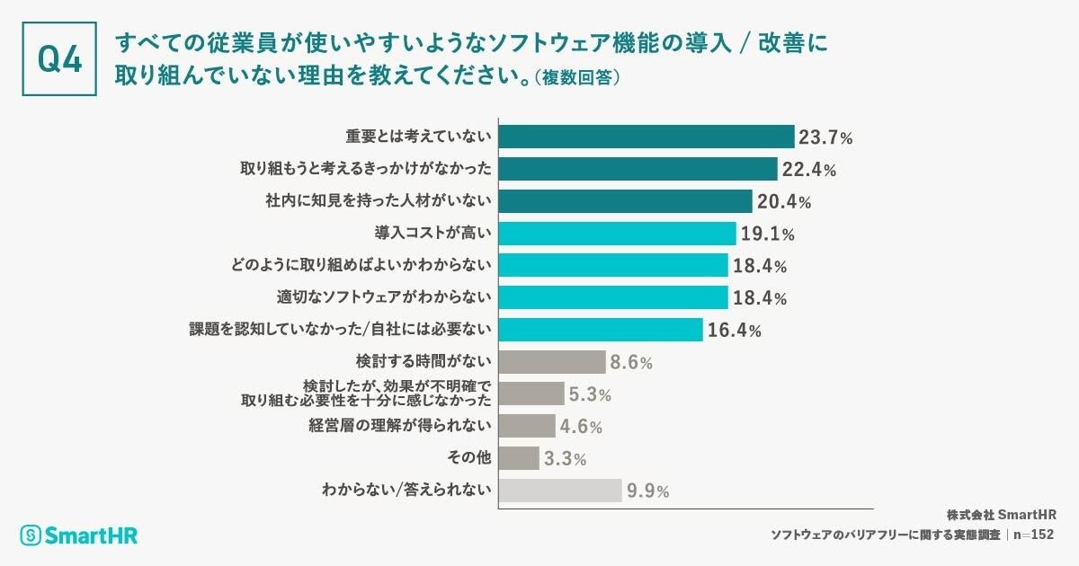 (2)で「まったく備わっていない」と回答した方に、「すべての従業員が使いやすいようなソフトウェア機能の導入/改善に取り組んでいない理由を教えてください。(複数回答)」と質問したところ、回答数が多い順に「重要とは考えていない」が23.7%、「取り組もうと考えるきっかけがなかった」が22.4%、「社内に知見を持った人材がいない」が20.4%という回答となりました。